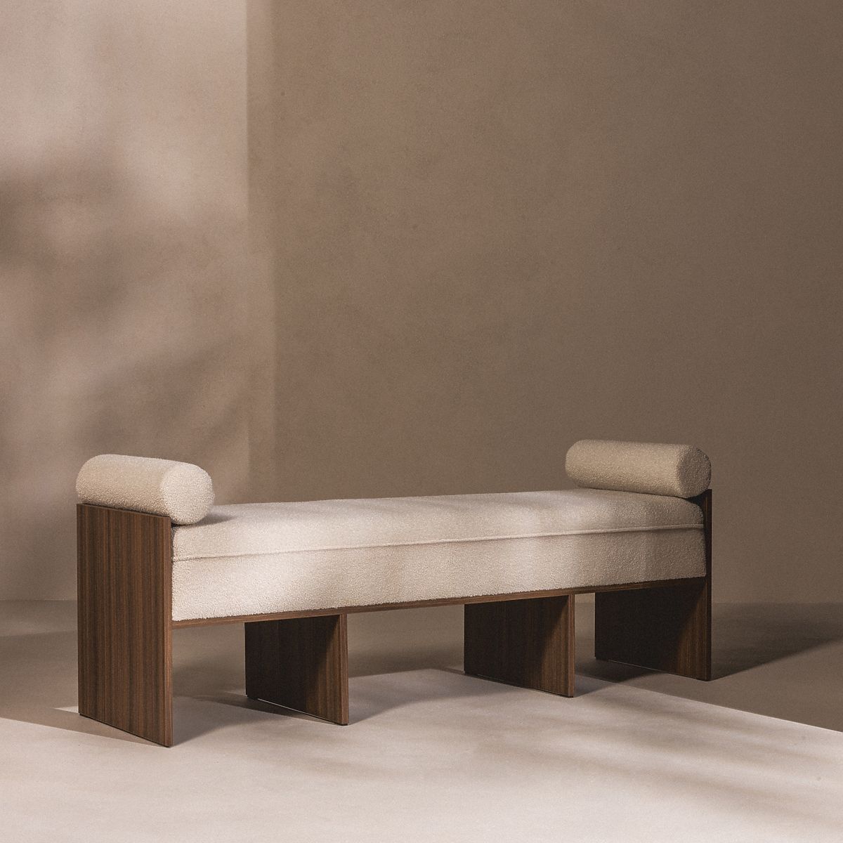 Gepolsterte Bank Loppo mit Nussbaum Wisconsin Basis und Bouclé-Stoff. .. mehr
