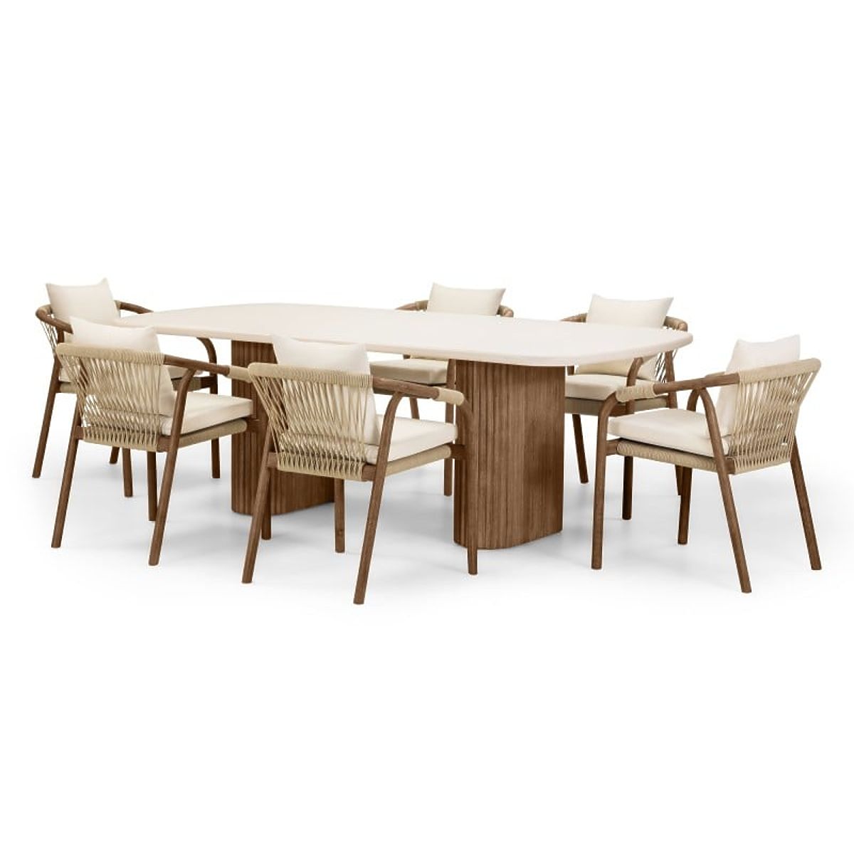 Das zentrale Element des Sets ist ein Tisch mit einer hellbeigen Platte, hergestellt aus dem innovativen Material Superstone – einem Verbundstoff, der natürlichen Stein perfekt imitiert, aber viel widerstandsfähiger gegen Witterungseinflüsse und UV-Strahlung ist. Seine sanft abgerundeten Kanten verleihen Leichtigkeit, während die massiven Lamellenbeine aus Akazienholz Eleganz unterstreichen und einen warmen, natürlichen Charakter verleihen.