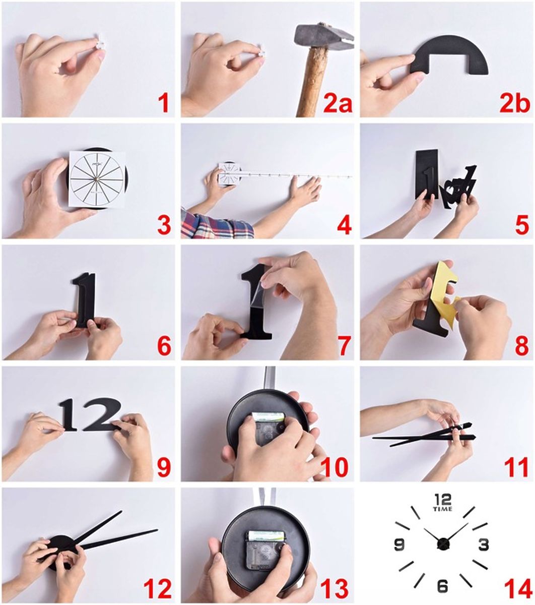 Moderne DIY-Uhr - mach es selbst. Ein tolles Accessoire für jedes Wohnzimmer oder Büro. Die Größe der Uhr hängt von Ihnen ab! DIY-Uhren haben den besten Effekt, wenn der Durchmesser der Uhr 80-100 cm beträgt, die Größe kann nach Ihrem Ermessen größer oder kleiner sein. Die Uhr kann an die Wand oder andere glatte Oberflächen geklebt werden.