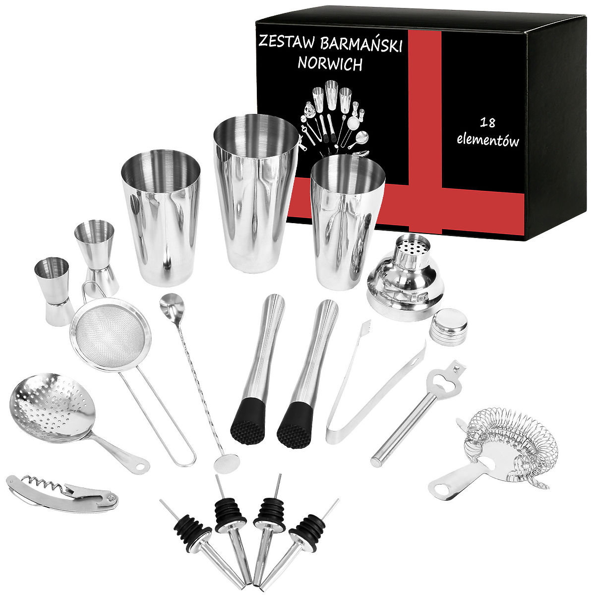 Hochwertiges Barkeeper-Set aus Edelstahl. Enthält alles Notwendige - Boston Shaker, Cobbler, Messbecher, Ausgießer und mehr. Detaillierte Liste unten. Das gesamte Set ist aus Edelstahl gefertigt, wodurch die Getränke ihren einzigartigen Geschmack behalten. Das Set kann bequem in der Spülmaschine gereinigt werden. Empfohlen als Geschenk.