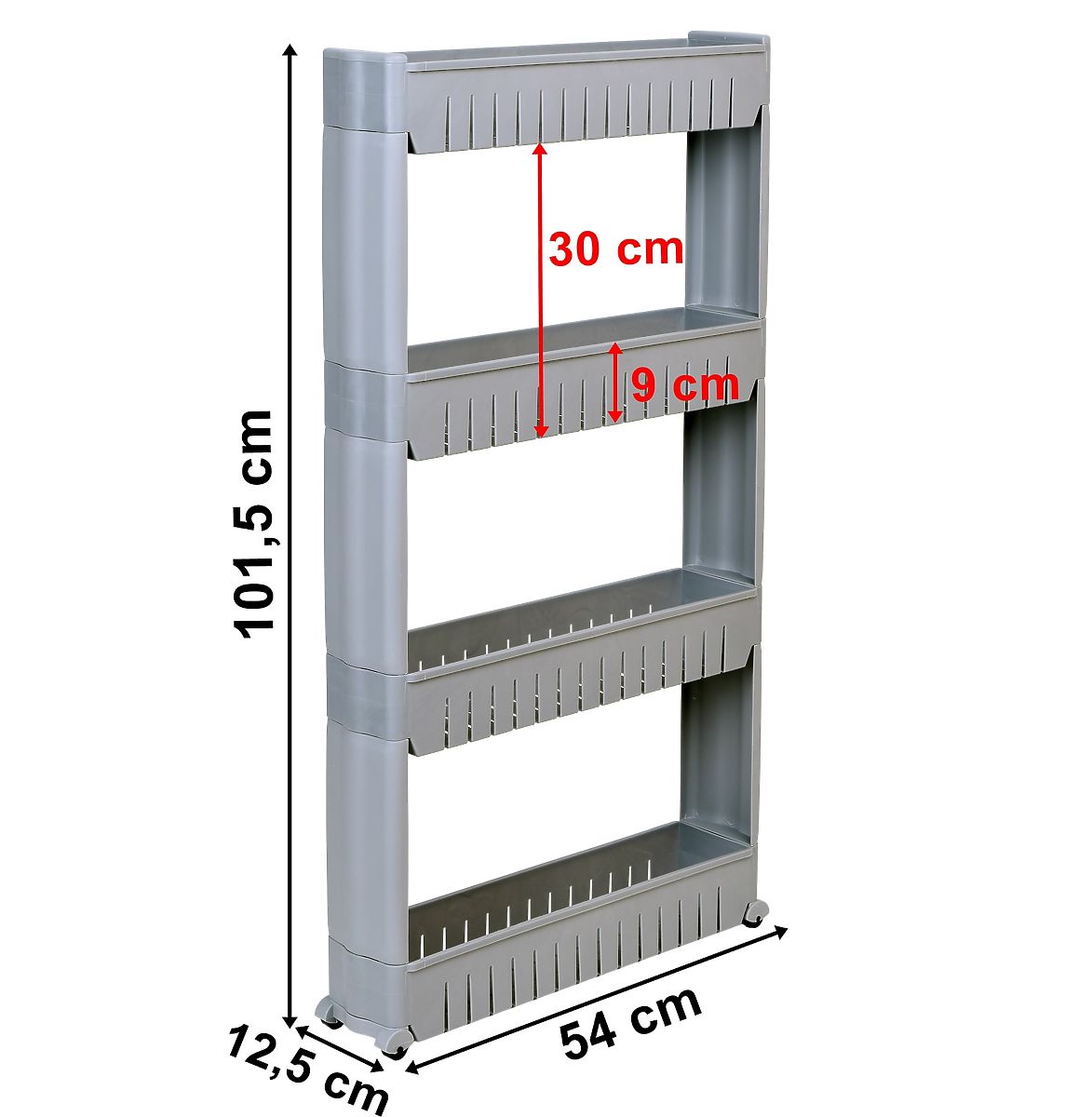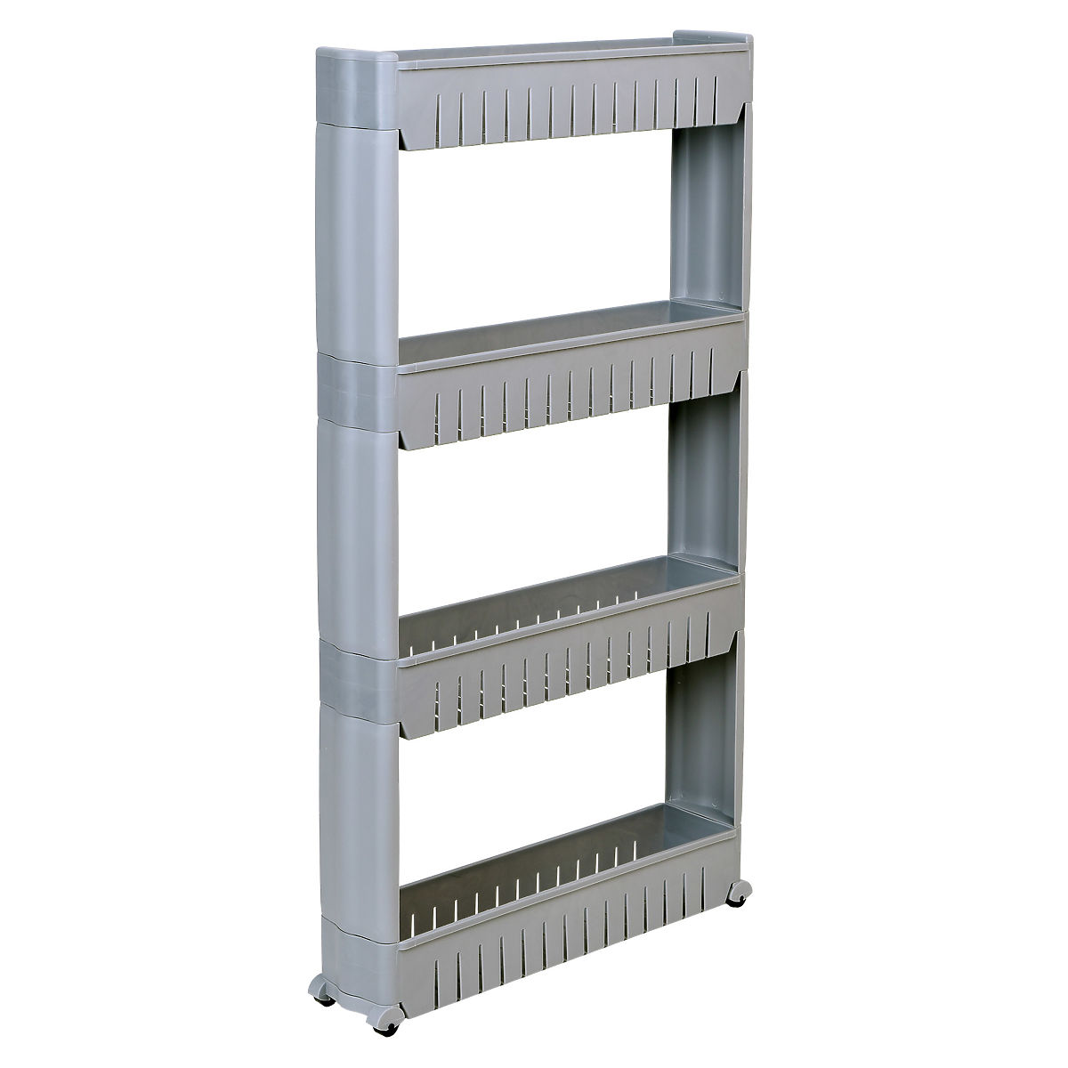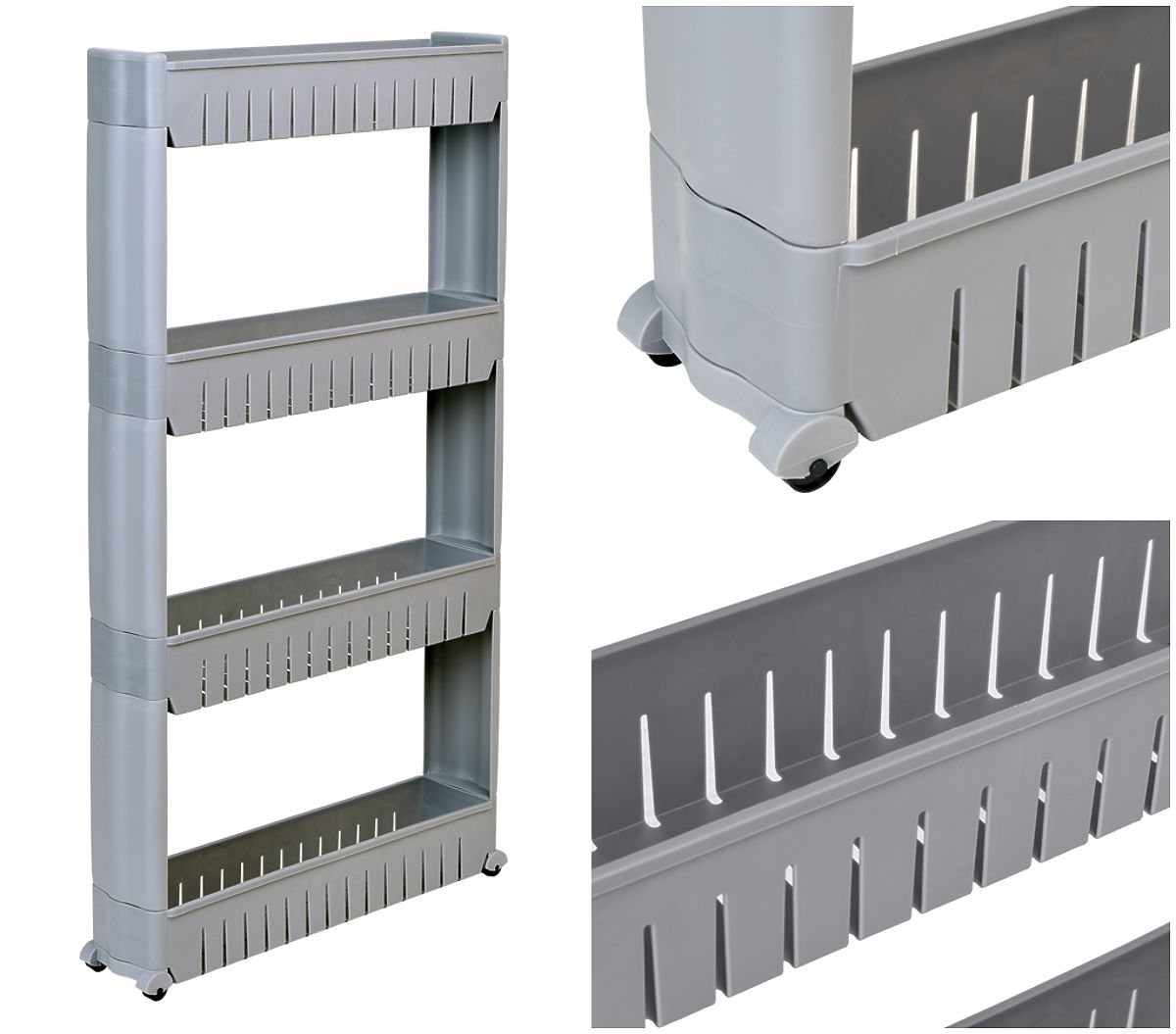 Ein mobiles Regal, ideal für enge Räume wie Küche oder Badezimmer. Seine modulare Konstruktion aus robustem Kunststoff ermöglicht eine einfache Anpassung an die Bedürfnisse – die Regalböden können hinzugefügt oder entfernt werden. Dank seiner kompakten Abmessungen passt es perfekt zwischen Schrank und Kühlschrank, Waschmaschine oder an andere schwer zugängliche Stellen. Das Küchenregal eignet sich hervorragend zur Aufbewahrung von Gewürzen, Küchenutensilien, Kosmetika, Reinigungsmitteln und vielen anderen notwendigen Dingen. Die Mobilität wird durch vier Rollen gewährleistet, die das Badezimmerregal auf Rollen leicht dorthin bewegen, wo es benötigt wird.