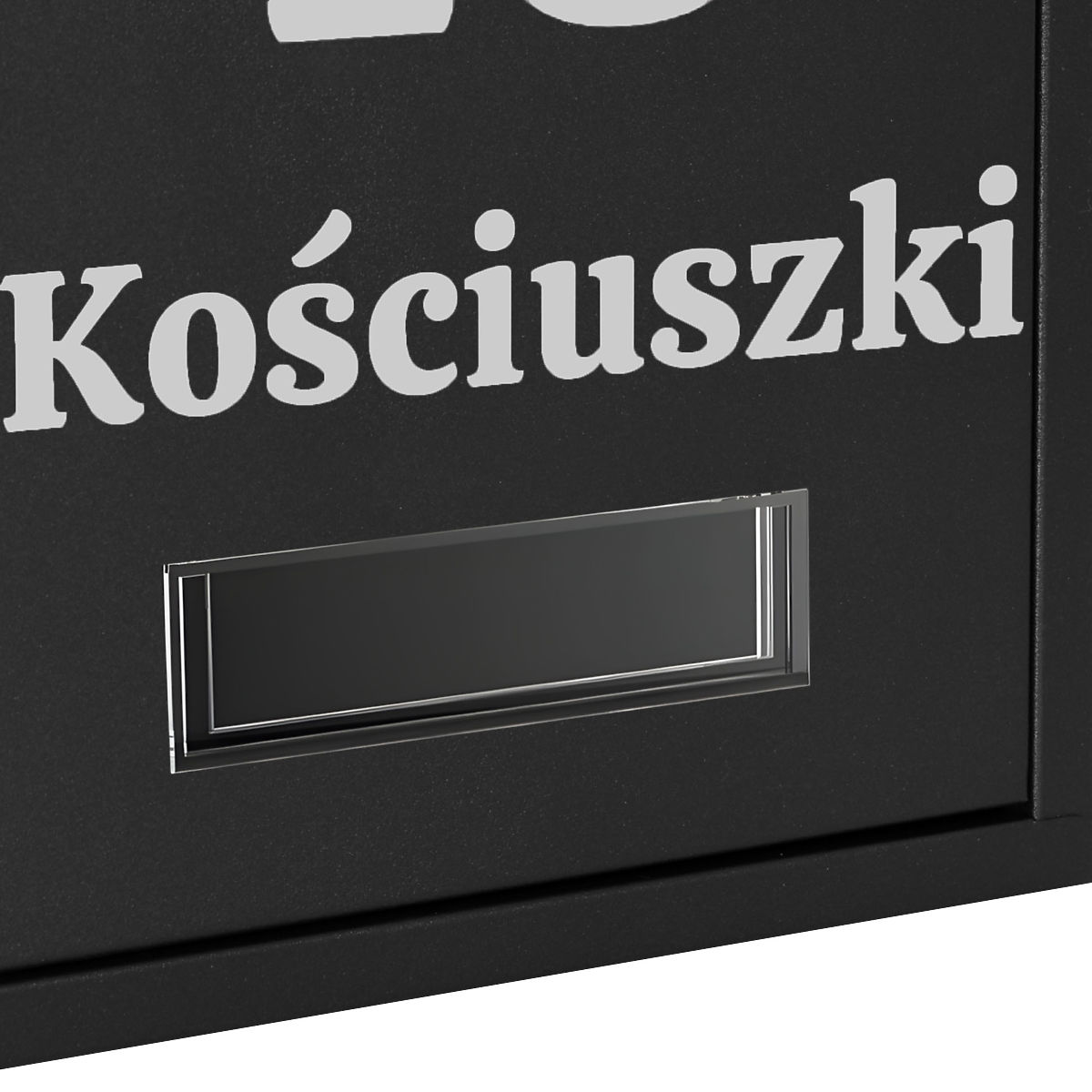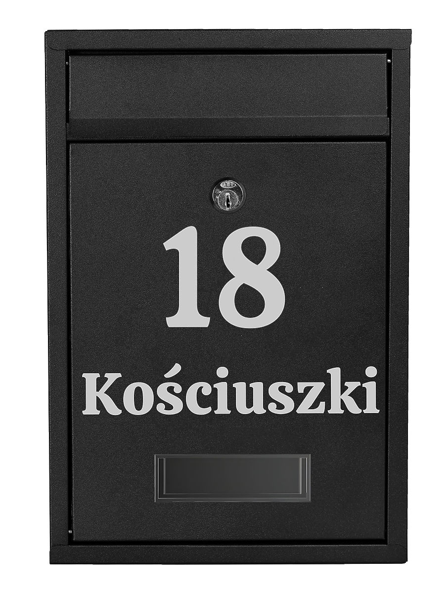 Möglichkeit zur Anbringung beliebiger Beschriftungen: Hausnummer, Firmenname, Nachname, Straße usw. Die Beschriftung erfolgt mit der Oracal-Folienplottermethode, die wetterfest ist. Die Folie ist silberfarben.