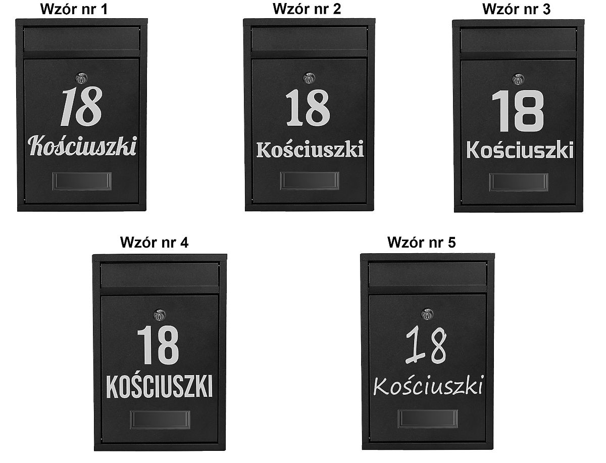 Nach dem Kauf geben Sie im Nachrichtenfeld für den Verkäufer an: gewähltes Schriftmuster, auszuführende Beschriftung. (Beispiel: Muster2, Kościuszki 18). Die Beschriftung wird genau nach den Anweisungen im Nachrichtenfeld für den Verkäufer ausgeführt. Beschriftungen können nur Großbuchstaben wie "KOŚCIUSZKI" oder Kleinbuchstaben wie "cicha" enthalten. Eine Ausnahme bildet Muster4, dessen Schriftart nur Großbuchstaben hat. Wenn die Beschriftung mit der Abkürzung der Straße "ul." erfolgen soll, geben Sie diese Information bitte ebenfalls an. Polnische Zeichen sind erlaubt (z.B.: ę,ą,ć,ś usw.). Verfügbare Muster: