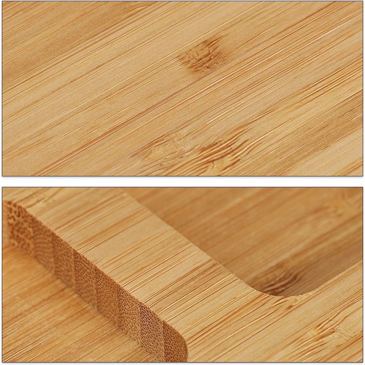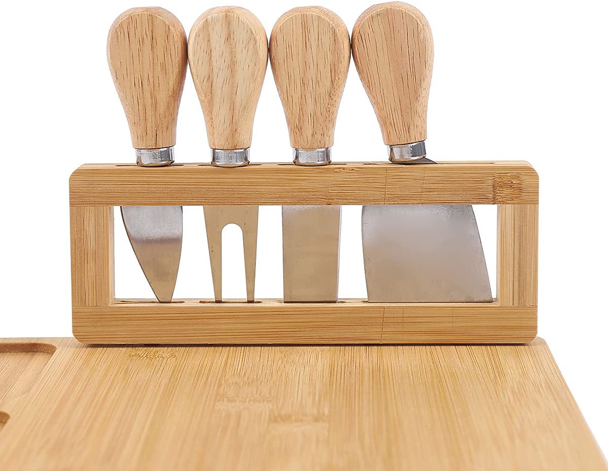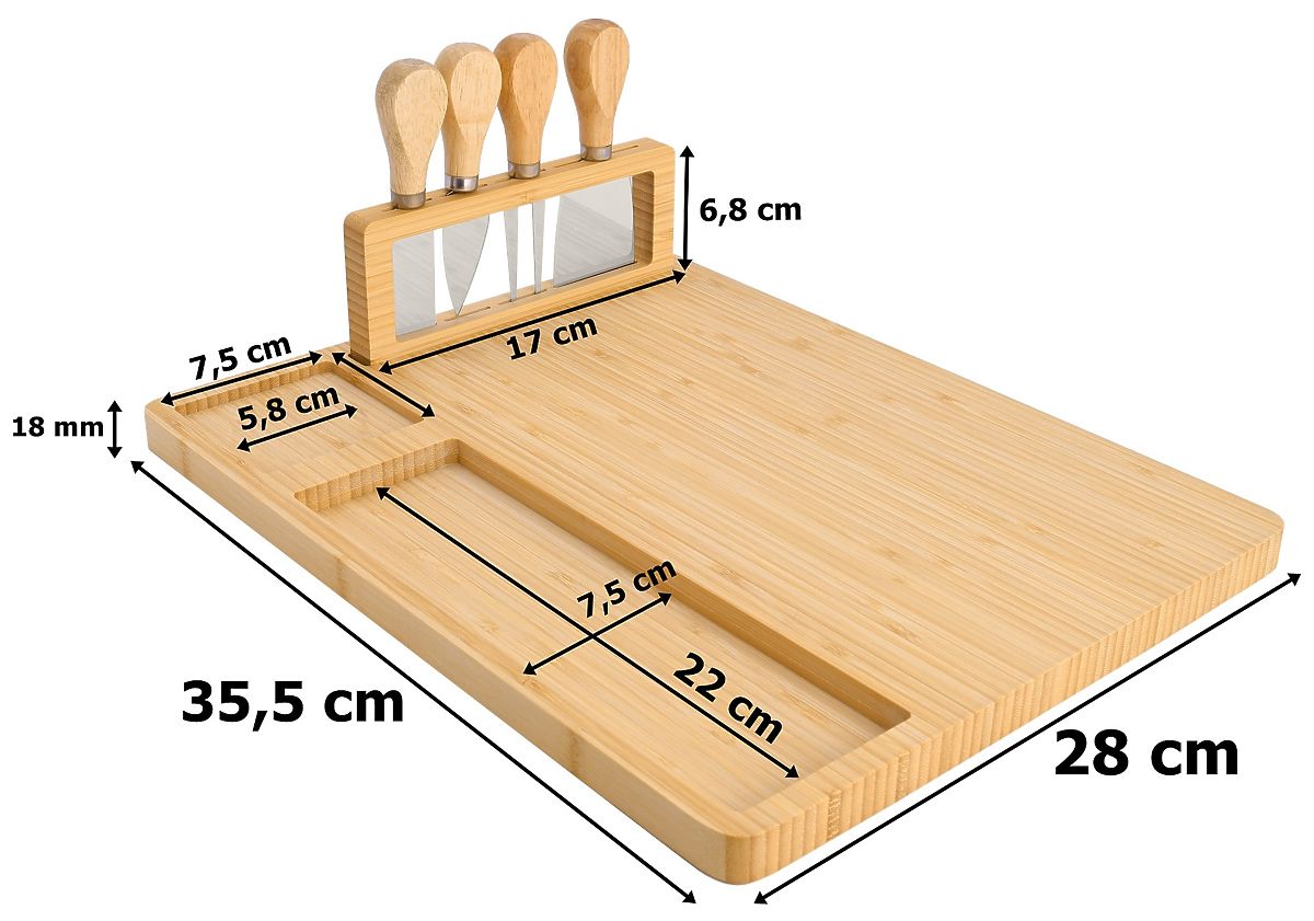 Käse- und Snackbrett Salers mit Besteck Verwendung: Zubereitung und Präsentation von Snacks ⭐️ Hervorragend zum Servieren von Käse und anderen Snacks! ⭐️ Hergestellt aus 100% Bambusholz ⭐️ Ständer mit einem Set aus Edelstahlmessern ⭐️ Tolle Geschenkidee ⭐️ Kauf direkt vom Hersteller ✨Käsebrett Salers mit einem Set aus Edelstahlmessern - Servieren Sie Käse wie ein Profi!✨ Das Käsebrett Salers ist eine elegante und praktische Möglichkeit, Käse und Snacks zu servieren, die Ihre Gäste beeindrucken wird. Hergestellt aus 100% natürlichem Bambus, sieht es nicht nur schön aus, sondern ist auch langlebig und pflegeleicht. Dank des speziellen Ständers mit Edelstahlmessern haben Sie alles, was Sie brauchen, zur Hand, und die praktischen Vertiefungen an den Rändern ermöglichen es, Beilagen effektvoll zu präsentieren. Ideal für Partys, Familientreffen und als Geschenkidee, verbindet das Salers Brett Funktionalität, Ästhetik und Haltbarkeit und beseitigt die Sorge um fehlende passende Accessoires oder Unordnung auf dem Tisch. Eigenschaften Material: 100% Bambus Inklusive: Brett + Besteckset aus Edelstahl auf Ständer Abmessungen Breite: 35,5 cm Tiefe: 28 cm Höhe: 1,7 cm Weitere Informationen Die dargestellten Farben sind als Richtwerte zu betrachten - sie können aufgrund unterschiedlicher Monitoreinstellungen und des Fotoanpassungsprozesses von den tatsächlichen Farben abweichen. Die tatsächlichen Abmessungen können von den oben genannten abweichen. Die Fehlertoleranz kann +/- 5% betragen. Marke: Gockowiak EAN-Code: 326015MG Material: natürlicher Bambus Brettstärke: 1,5 cm Breite: 35,5 cm Länge: 28 cm Anzahl der Messer: vier