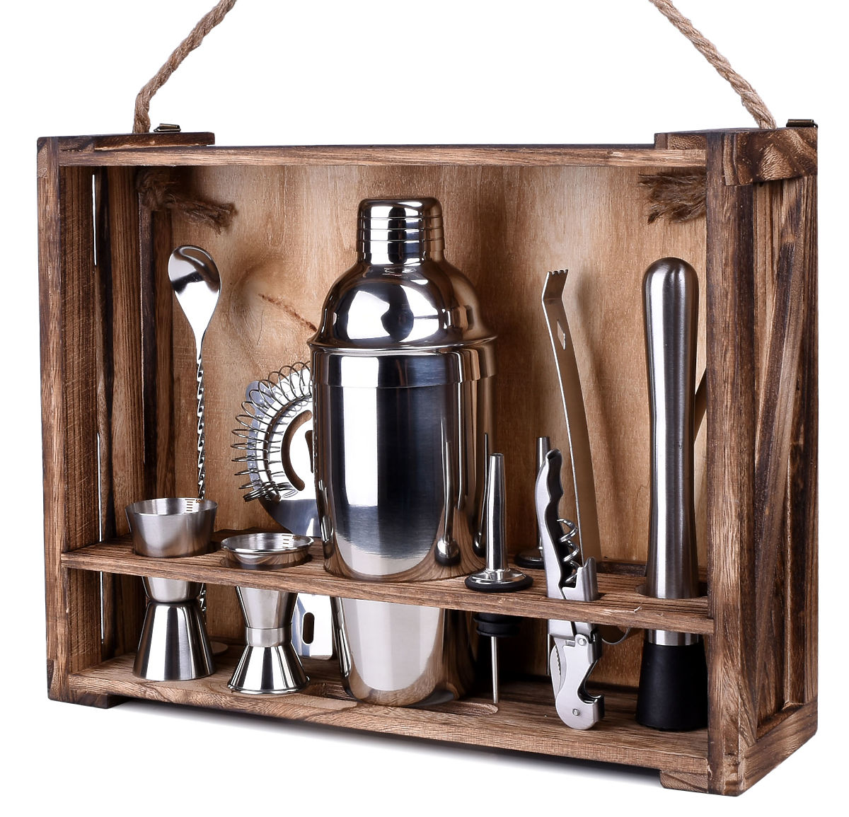 Barkeeper-Set LOGAN mit 11 Teilen aus Edelstahl und karbonisiertem Kiefernholz. .. mehr