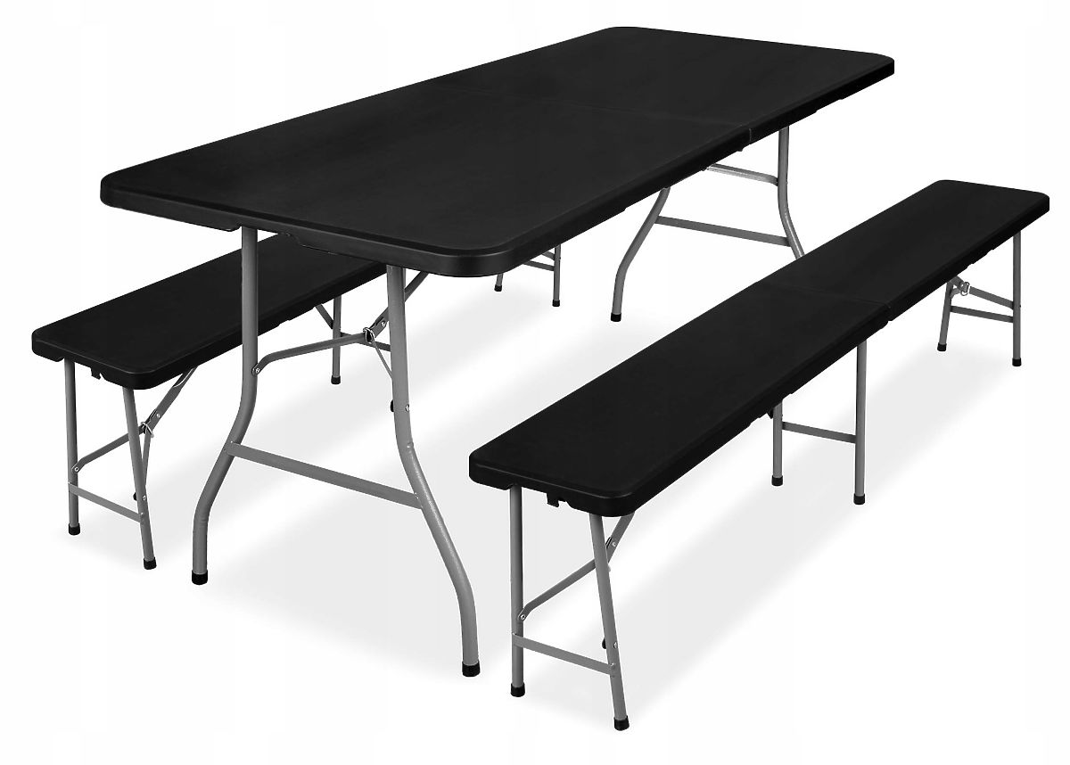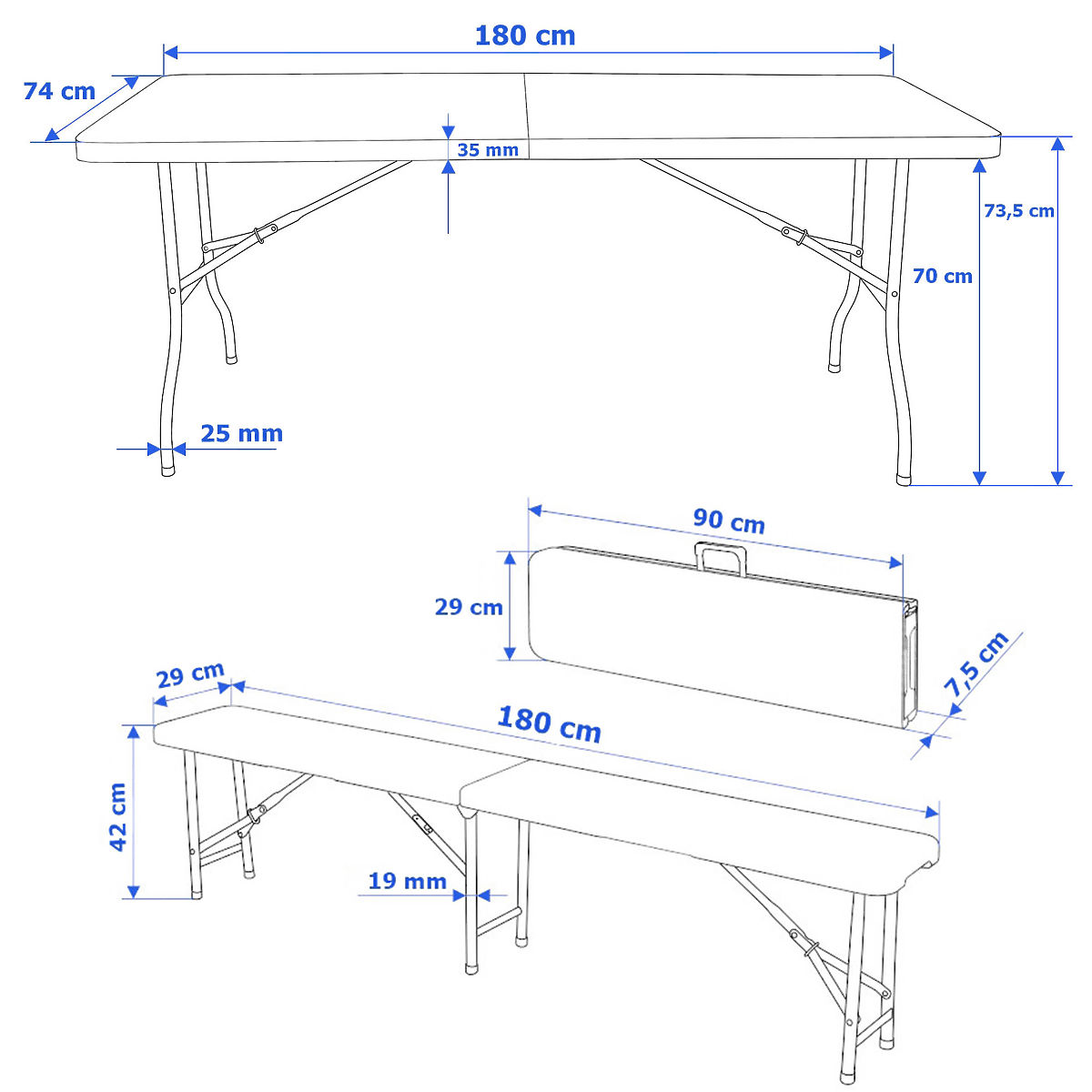 Catering-Set Feta 180 Schwarz +2 Bänke Verwendung: Außenbereich, Garten | Material: Stahl, Kunststoff | Farbe der Sitzfläche/Platte: Schwarz ⭐️ Set 100% wasserdicht ⭐️ Tisch und Bänke zusammenklappbar zu Koffern ⭐️ Robustes Klapp- und Entfaltungssystem ⭐️ Kauf direkt vom Hersteller Klappbares Catering-Set. Sehr praktisch und leicht. Konstruktion aus pulverbeschichtetem Stahl. Platte und Sitzflächen aus robustem HDPE-Kunststoff. Sowohl Tisch als auch Bänke verfügen über spezielle Klappschlösser, die nach dem Entfalten Stabilität gewährleisten. Das Set ist wetter- und UV-beständig. Tisch und Bänke bilden nach dem Zusammenklappen praktische Koffer, die wenig Platz beanspruchen und leicht zu transportieren sind. Eingebaute Griffe erleichtern das Tragen. Die Beine des Tisches und der Bänke sind mit rutschfesten Endkappen ausgestattet, die Stabilität gewährleisten. Produkteigenschaften stabile Konstruktion zuverlässiges und robustes Klapp- und Entfaltungssystem. Material der Platte und Sitzfläche: HDPE-Polyethylen 100% wasserdicht Langlebigkeit über viele Saisons Rahmenmaterial: pulverbeschichteter Stahl Beindicke bei der Bank: 19 mm Beindicke beim Tisch: 25 mm zusammenklappbar, bequeme Tragegriffe leicht, nimmt wenig Platz nach dem Zusammenklappen ein Beine mit Stützen und Schloss rutschfeste Endkappen gewährleisten Stabilität Gewichte: Tisch 10,5 kg, Bank 7 kg Produktabmessungen Abmessungen des entfalteten Tisches: Länge 180 cm Breite 74 cm Höhe zur Oberseite der Platte 73,5 cm Höhe zur Unterseite der Platte 70 cm Plattendicke an den Rändern 3,5 cm Dicke des Metallrahmens 25 mm Beinabstand 57 x 155 cm Abmessungen des zusammengeklappten Tisches (Koffer): 74 x 92,5 x 7 cm Abmessungen der entfalteten Bank: Länge: 180 cm Tiefe: 29 cm Höhe: 42 cm Abmessungen der zusammengeklappten Bank (Koffer) 90 x 29 x 7,5 cm Weitere Informationen Die dargestellten Farben sind indikativ - sie können aufgrund unterschiedlicher Monitoreinstellungen und des Fotobearbeitungsprozesses von den tatsächlichen abweichen. Die tatsächlichen Abmessungen können von den oben angegebenen abweichen. Die Fehlertoleranz kann +/- 5% betragen. Marke: eHokery EAN-Code: 5902340327173 Material: Stahl und HDPE Tischhöhe: 73,5 cm Plattenabmessungen: 180 x 74 cm Bankhöhe: 42 cm Sitzflächenabmessungen der Bank: 180 x 29 cm