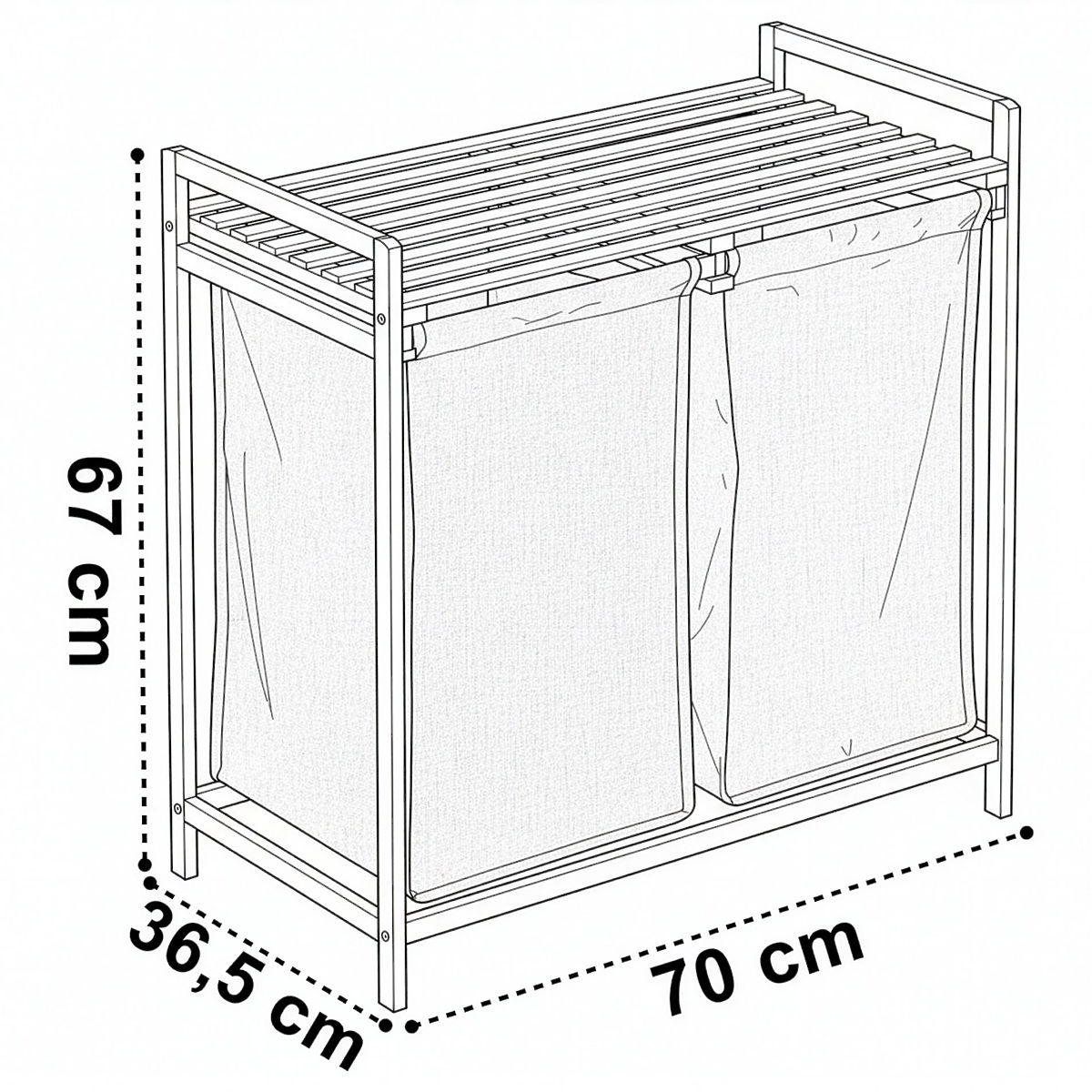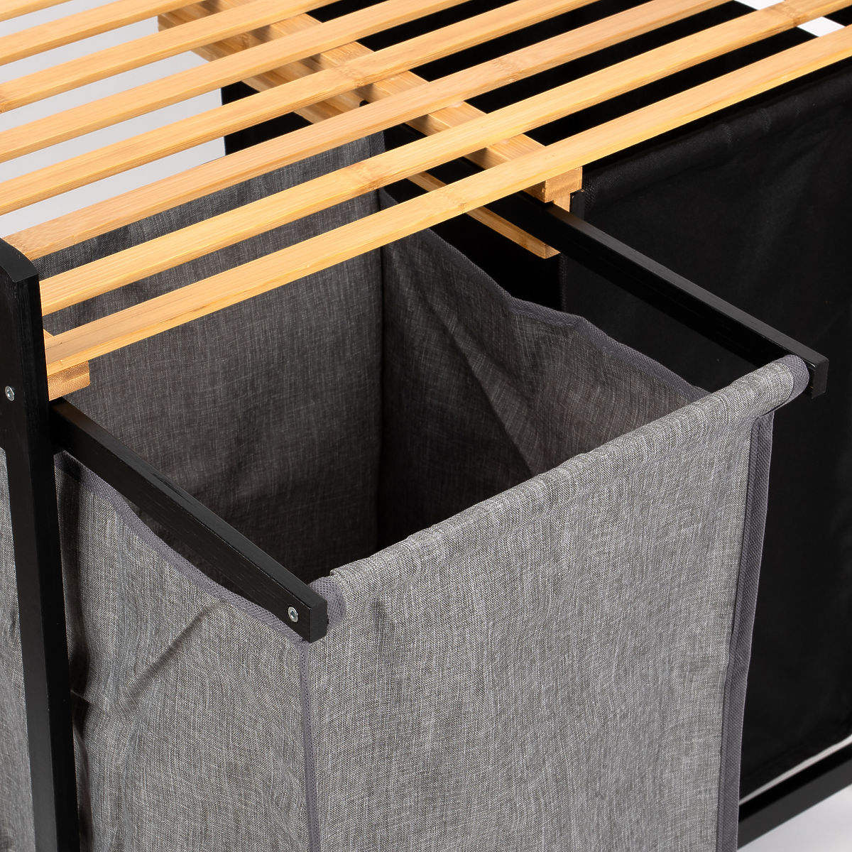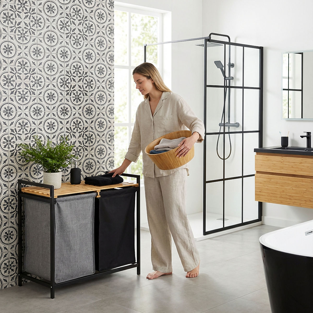 Der Bambus-Wäschekorb Hanoi Black Duo Farbe ist eine stilvolle und funktionale Lösung für das moderne Badezimmer. Mit einer Kapazität von 80 Litern und der Aufteilung in zwei Kammern erleichtert er das Sortieren der Wäsche. Das praktische obere Regal eignet sich für Waschmittel, Zubehör oder Dekorationen. Die Stoffkörbe lassen sich leicht herausziehen und die einfache Montage ohne Bohren ermöglicht eine schnelle Einsatzbereitschaft. Ideal für Loft- und moderne Interieurs.