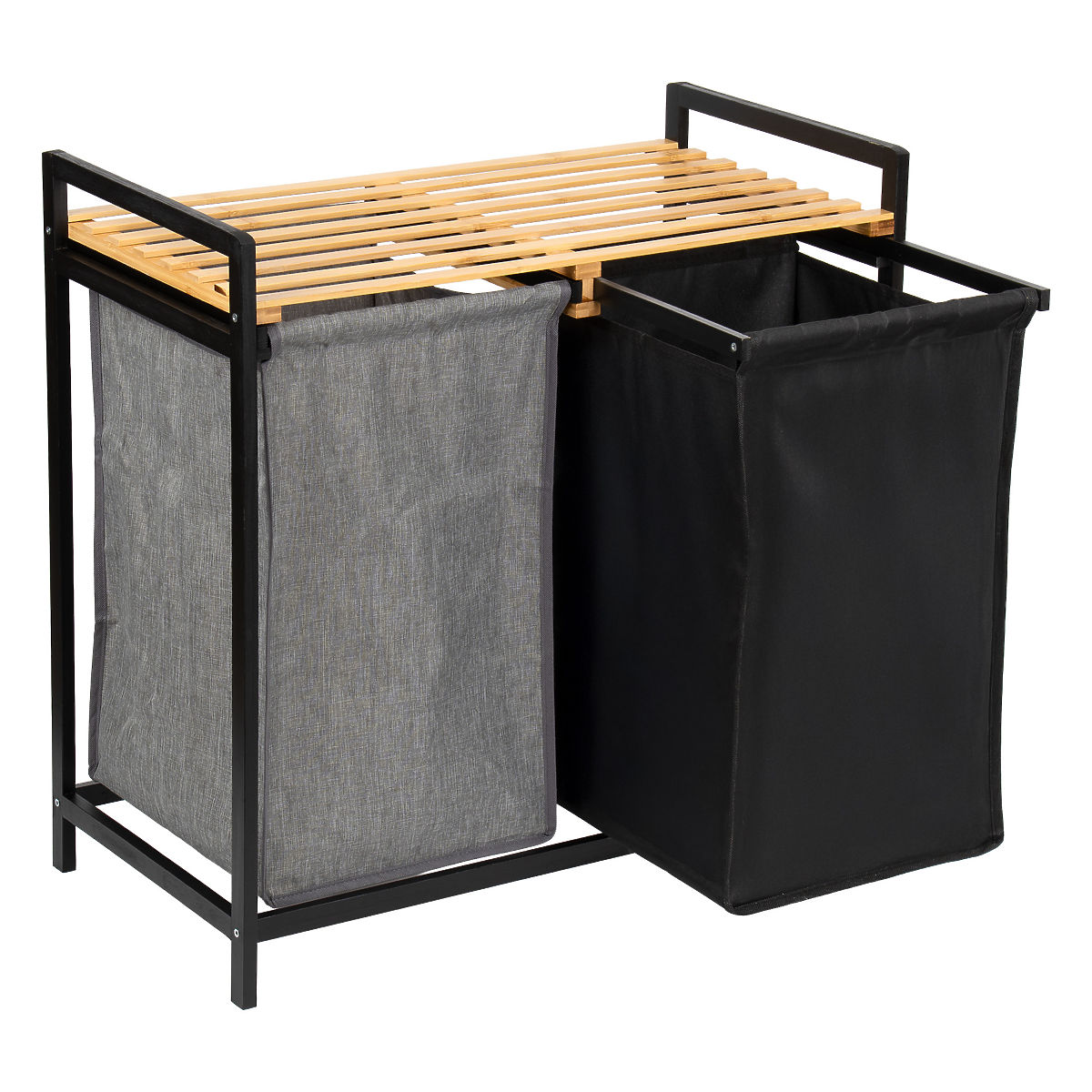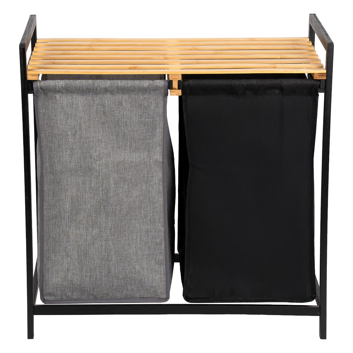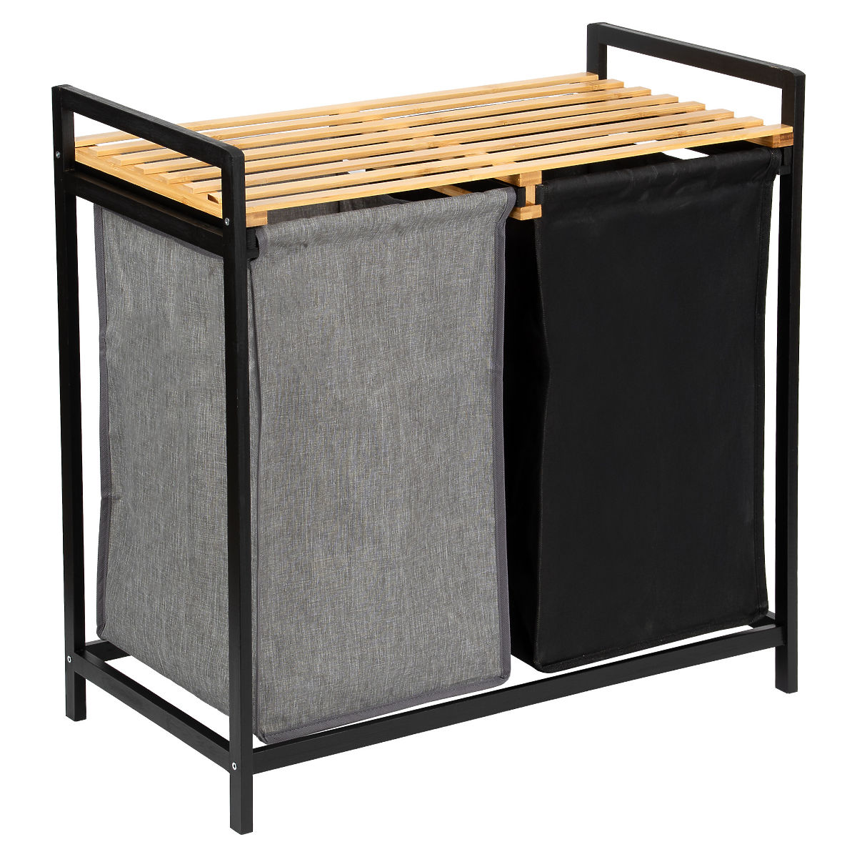 Der Bambus-Wäschekorb Hanoi Black Duo Farbe ist eine stilvolle und funktionale Lösung für das moderne Badezimmer. Mit einer Kapazität von 80 Litern und der Aufteilung in zwei Kammern erleichtert er das Sortieren der Wäsche. Das praktische obere Regal eignet sich für Waschmittel, Zubehör oder Dekorationen. Die Stoffkörbe lassen sich leicht herausziehen und die einfache Montage ohne Bohren ermöglicht eine schnelle Einsatzbereitschaft. Ideal für Loft- und moderne Interieurs.