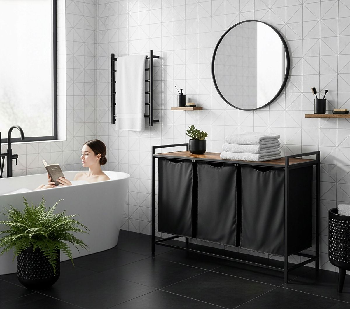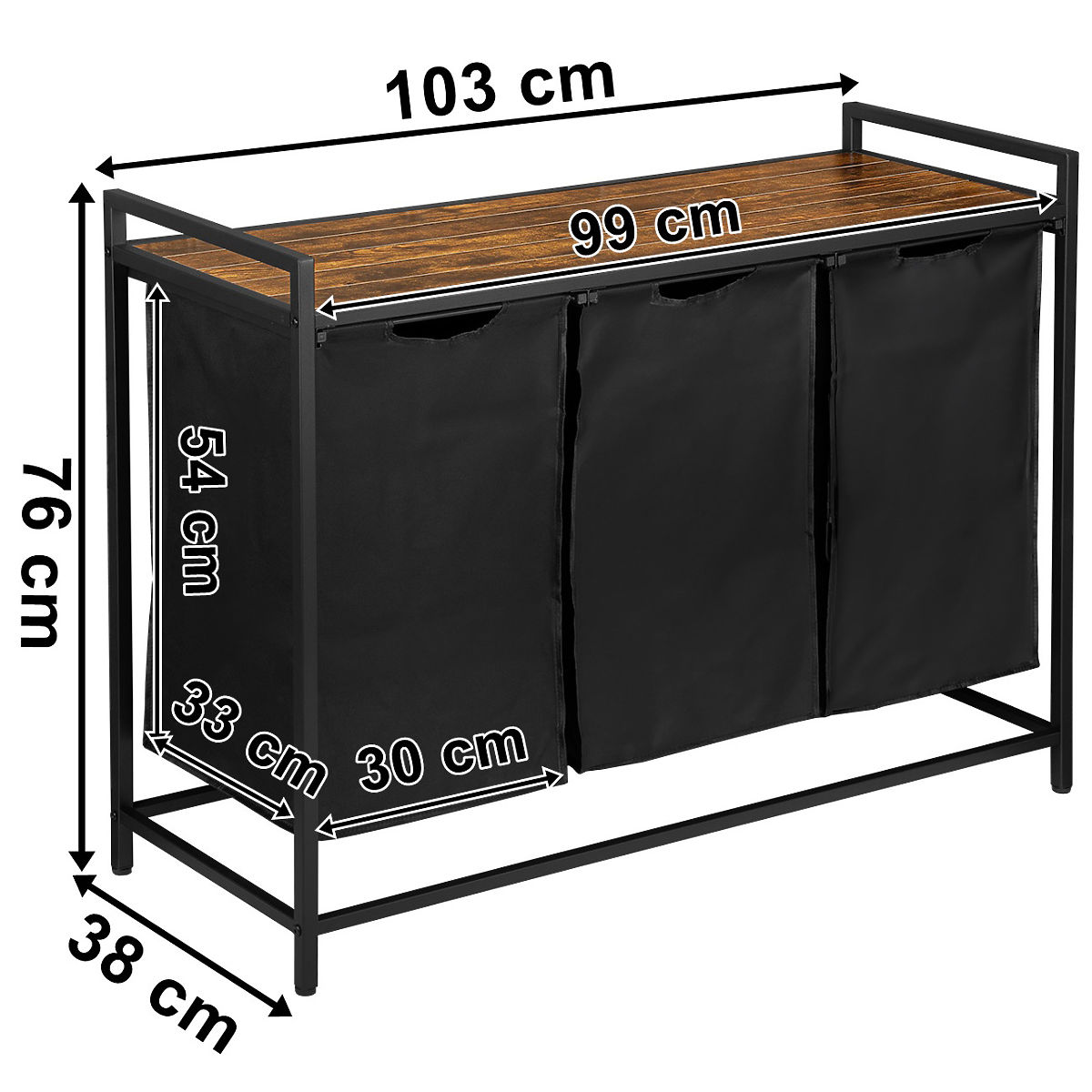 Wäschekorb ARTUS 3 Fächer Bestimmung: Badezimmer | Farben: Schwarz/Alteiche ⭐️ Robuste Stahlkonstruktion ⭐️ Drei Fächer für Wäsche oder Unterwäsche ⭐️ Herausziehbare Textilbehälter ⭐️ Praktisches Regal in Alteiche ⭐️ Große Kapazität von 160L ⭐️ Direkt vom Hersteller ✨Dreifach-Wäschekorb LofInspired Artus mit 3 Körben 160L✨ ☑️ Farbe: Schwarz/Alteiche Der dreifach-Wäschekorb Artus ist die ideale Lösung für alle, die Ordnung und Funktionalität im Badezimmer schätzen. Sein loftartiges, industrielles Design passt perfekt in moderne Innenräume und bietet maximalen Komfort und Platzersparnis. Die drei getrennten Fächer ermöglichen eine genaue Trennung der Wäsche, was die Organisation der täglichen Aufgaben erleichtert. Zudem bietet das praktische Regal über den Körben einen idealen Platz für Handtücher und Badezimmerzubehör. Mit dem Artus-Korb bereichern Sie nicht nur die Ästhetik Ihres Badezimmers, sondern erhöhen auch dessen Funktionalität. Eigenschaften Rahmenmaterial: pulverbeschichteter Stahl Regalmaterial: laminierte Platte in Alteiche Körbe: drei schwarze, herausziehbar auf Schienen mit verstärktem Boden Befestigung der Körbe: Klettverschlüsse Regal für Zubehör: über den Körben Füße: verstellbar, ermöglichen Nivellierung Stil: loftartig, industriell Maximale Belastung des Regals: 20 kg Maximale Belastung jedes Korbes: 5 kg Abmessungen Höhe: 77 cm Breite: 103 cm Tiefe: 38 cm Regalbreite: 99 cm Abmessungen eines Fachs Höhe: 52 cm Breite: 34 cm Tiefe: 30 cm Weitere Informationen Die dargestellten Farben sind indikativ - sie können aufgrund unterschiedlicher Monitoreinstellungen und des Fotobearbeitungsprozesses von den tatsächlichen abweichen. Die tatsächlichen Abmessungen können von den oben angegebenen abweichen. Die Fehlertoleranz kann +/- 5% betragen. Marke: LoftInspired Produktcode: MG063912 EAN-Code: 5905523063912 Farbe: Schwarz Höhe: 76 cm Breite: 103 cm Rahmenmaterial: pulverbeschichteter Stahl