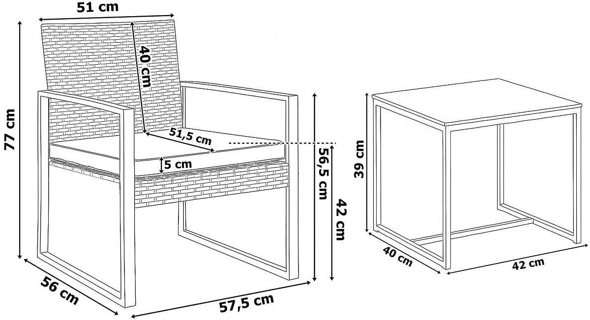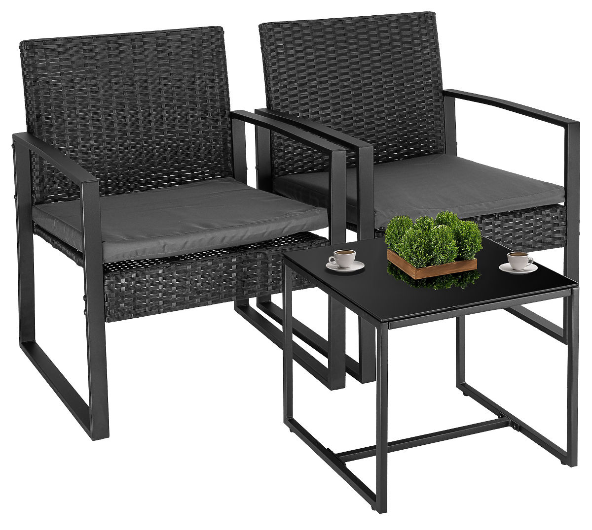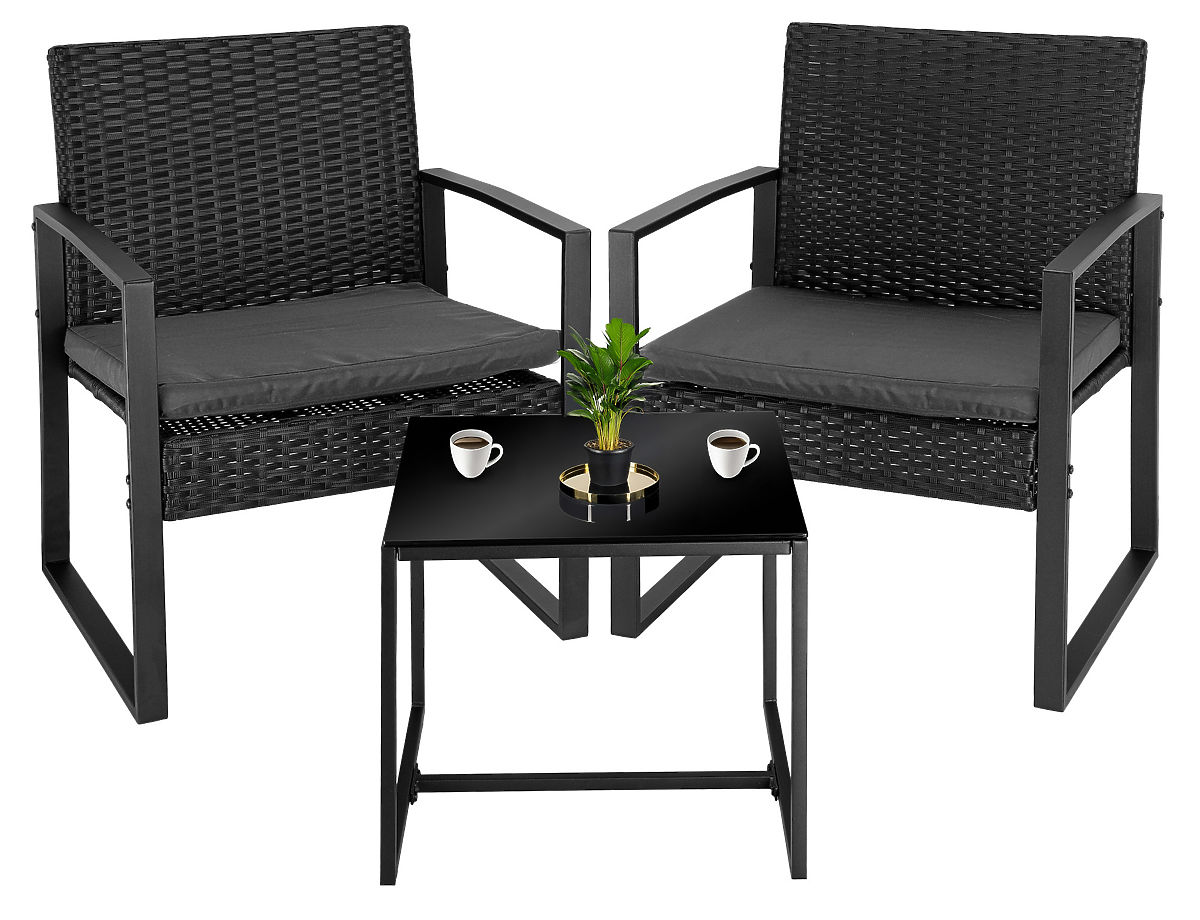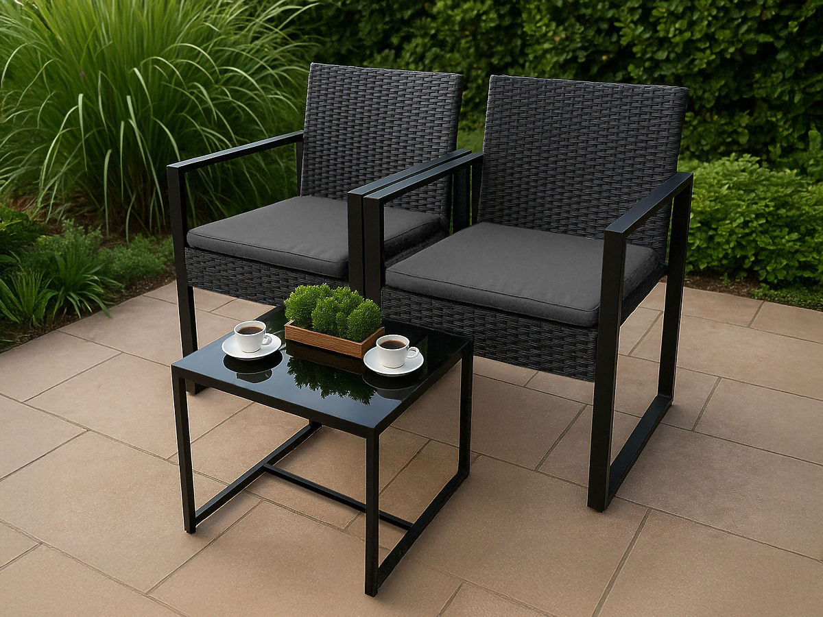Gartenmöbel-Set COFFI TISCH + 2 STÜHLE Modell: COFFI | Möbel Farbe: schwarz | Kissenfarbe: grau Produkteigenschaften: ✅ Komplettes 3-teiliges Set ✅ Robuste Ausführung ✅ Bequeme Kissen im Set ✅ Platte aus gehärtetem Glas ✅ Kompakte Größe ✅ Wasserfest Das kompakte Set aus zwei Stühlen und einem Tisch ermöglicht es, eine gemütliche Kaffee-Ecke zu schaffen, unabhängig von der Größe des Raumes. Das Set ist aus Technorattan und pulverbeschichtetem Stahl gefertigt. Bequeme Kissen sorgen für Komfort auch bei längerem Entspannen. Das Coffi-Set vereint modernes Design mit Praktikabilität – eine Investition in den täglichen Komfort, die sich lohnt. Spezifikationen: Set-Inhalt: 2 Stühle + 1 Tisch Farbe: schwarz Material: Technorattan Kissen: grau, 5 cm dick Beine: Stahl, pulverbeschichtet Platte: schwarzes gehärtetes Glas, 5 mm dick Maximale Belastbarkeit des Stuhls: 150 kg Maximale Belastbarkeit des Tisches: 40 kg Stuhlmaße: Höhe: 77 cm Breite: 57,5 cm Tiefe: 56 cm Tischmaße: Höhe: 39 cm Breite: 42 cm Tiefe: 40 cm Weitere Informationen Die angegebenen Farben sind Richtwerte - sie können aufgrund unterschiedlicher Monitoreinstellungen und des Fotobearbeitungsprozesses von den tatsächlichen Farben abweichen. Die tatsächlichen Abmessungen können von den oben angegebenen abweichen. Die Toleranz kann +/- 5% betragen. Marke: eHokery Produktcode: 068115MG EAN-Code: 5905523068115 Möbel Farbe: schwarz Material: Technorattan Konstruktionsmaterial: Stahl Verwendung: Garten | Terrasse | Balkon Zur Selbstmontage: ja