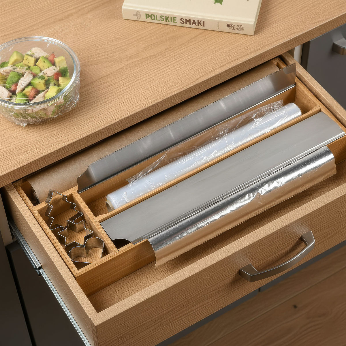 Bambusfolie-Spender BORDE Modell: BORDE | Material: 100% Bambus | Verwendung: Schublade, Küchenarbeitsplatte ⭐️ Höchste Qualität ⭐️ 100% Bambusholz ⭐️ Präzise Edelstahlschneider ⭐️ Universelle Verwendung ⭐️ 4 praktische Fächer ⭐️ Einkauf direkt vom Hersteller ✍️ Spezifikationen: Material: Naturbambus + Edelstahl Farbe: Braun (Bambus) + Silber (Stahl) Stil: Minimalistisch, modern Verwendung: Frischhaltefolie, Aluminiumfolie, Backpapier, Beutel, Küchenrollen Anzahl der Fächer: 4 Marke: Gockowiak Gewicht: 0,95 kg ✍️ Abmessungen: Höhe: 5,5 cm Breite: 42 cm Tiefe: 19,5 cm Weitere Informationen Die angezeigten Farben sind indikativ - sie können aufgrund unterschiedlicher Monitoreinstellungen und des Fotobearbeitungsprozesses von den tatsächlichen abweichen. Die tatsächlichen Abmessungen können von den angegebenen abweichen. Fehlertoleranz kann +/- 5% betragen. Marke: Gockowiak EAN-Produktcode: 5902340332436 Farbe: Natur Höhe: 5,5 cm Breite: 42 cm Tiefe: 19,5 cm