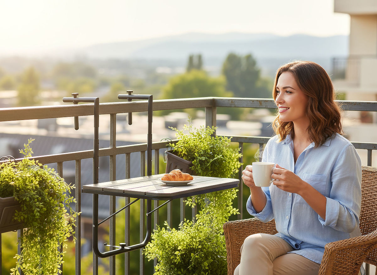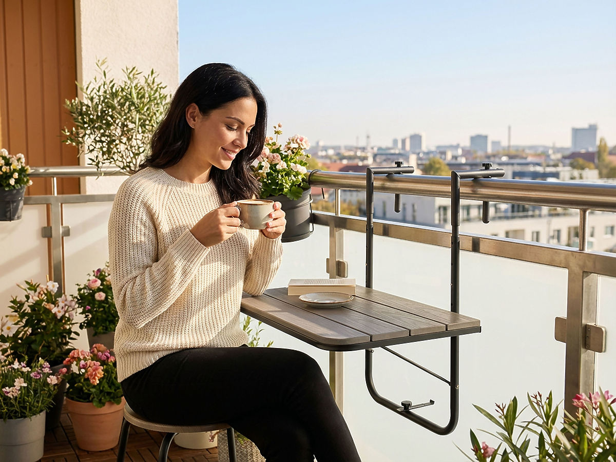 Klappbarer Balkontisch mit grauer Holzoptik, ideal für kleine Räume. .. mehr