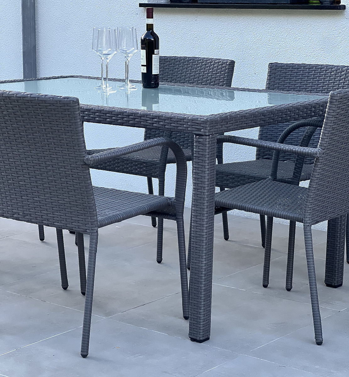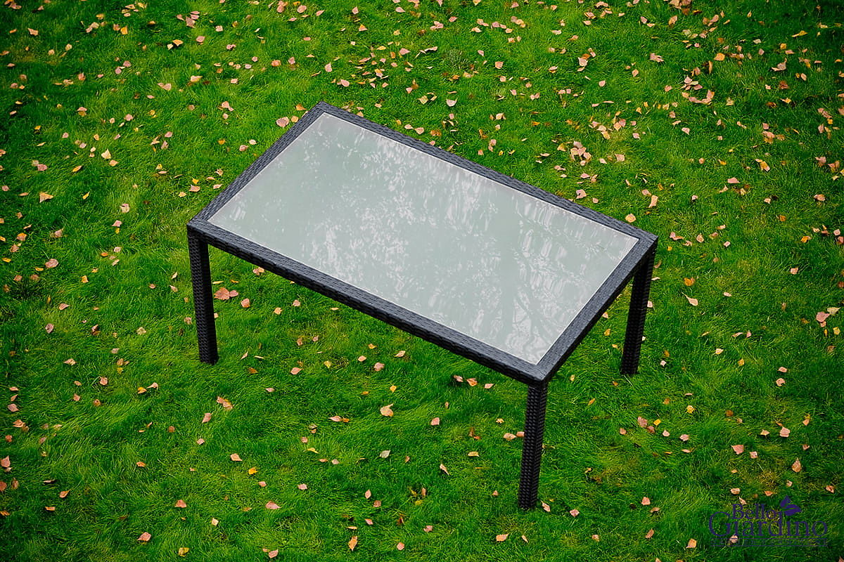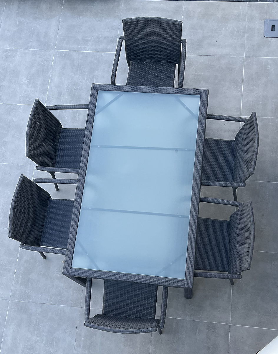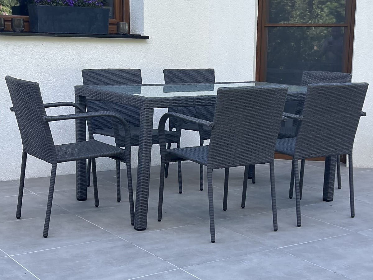 Möbelkonstruktion: Tisch – Aluminium, Stühle – Stahl. Das Set besteht aus 7 Teilen: 1 × Tisch (mit mattierter Glasplatte aus 5 mm Sicherheitsglas): Länge 150 cm, Breite 90 cm, Höhe 74 cm, 6 × Stühle: Breite 56 cm, Tiefe 50 cm, Höhe 84 cm, Sitzhöhe vom Boden 44 cm, Rückenlehnenhöhe vom Sitz 43 cm, Sitzbreite 40 cm, Sitztiefe 43 cm. Das Set wird auf 1 Palette mit den Maßen 120 × 80 × 170 cm geliefert, Gewicht 60 kg. Möglichkeit, Kissen für die Stühle hier zu kaufen. Die Stühle können sofort nach dem Auspacken verwendet werden. Die Stühle sind stapelbar (können ineinander gestellt werden), was die Lagerung erheblich erleichtert und Platz spart. Der Tisch ist für eine einfache Selbstmontage gemäß der beiliegenden Anleitung vorgesehen. Der mattierte Glastisch ist in einen Technorattan-Rahmen eingesetzt. Technorattan ist beständig gegen schädliche Witterungseinflüsse, jedoch empfehlen wir für eine längere Erhaltung des Aussehens den Kauf einer Schutzhülle. Die Abdeckung in dunkelgrauer Farbe ist einteilig und hat eine untere Kordel zum Festziehen. Alle Abdeckungen sind maßgeschneidert, die Realisierungszeit beträgt ca. 14 Arbeitstage.