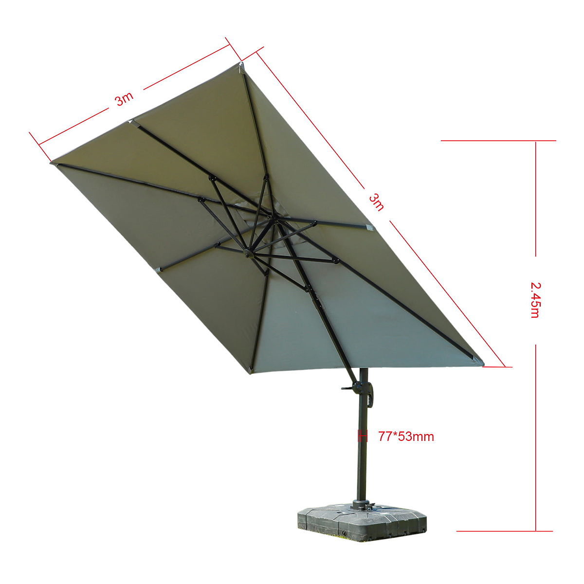 Der Gartenschirm ist die ideale Kombination aus Stil und Funktionalität. Der große Schirm schützt nicht nur effektiv vor schädlichen Sonnenstrahlen, sondern stellt auch eine außergewöhnliche Dekoration dar. Dank der einfachen Neigungswinkelverstellung können Sie den Schirm an Ihre Bedürfnisse anpassen, was maximalen Schutz und Komfort gewährleistet. Der Terrassenschirm hat einen Bezug aus 100% Polyester, was Langlebigkeit und Beständigkeit gegen verschiedene Wetterbedingungen, einschließlich Feuchtigkeit und UV-Strahlung, garantiert. Die einfache Bedienung mit der Kurbel ermöglicht ein schnelles Zusammen- und Aufklappen, was ihn zur idealen Wahl für jeden macht, der Komfort und Qualität schätzt. Farbe des Schirms: Ecru Form: quadratisch Material des Bezugs: 100% Polyester Konstruktion des Schirms: Aluminium 1 x Schirm: Maße: 300 cm x 300 cm Höhe: 245 cm Der Schirmständer ist Teil des Sets - der Ständer hat einen Wassertank!