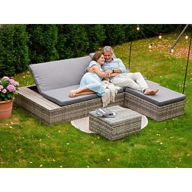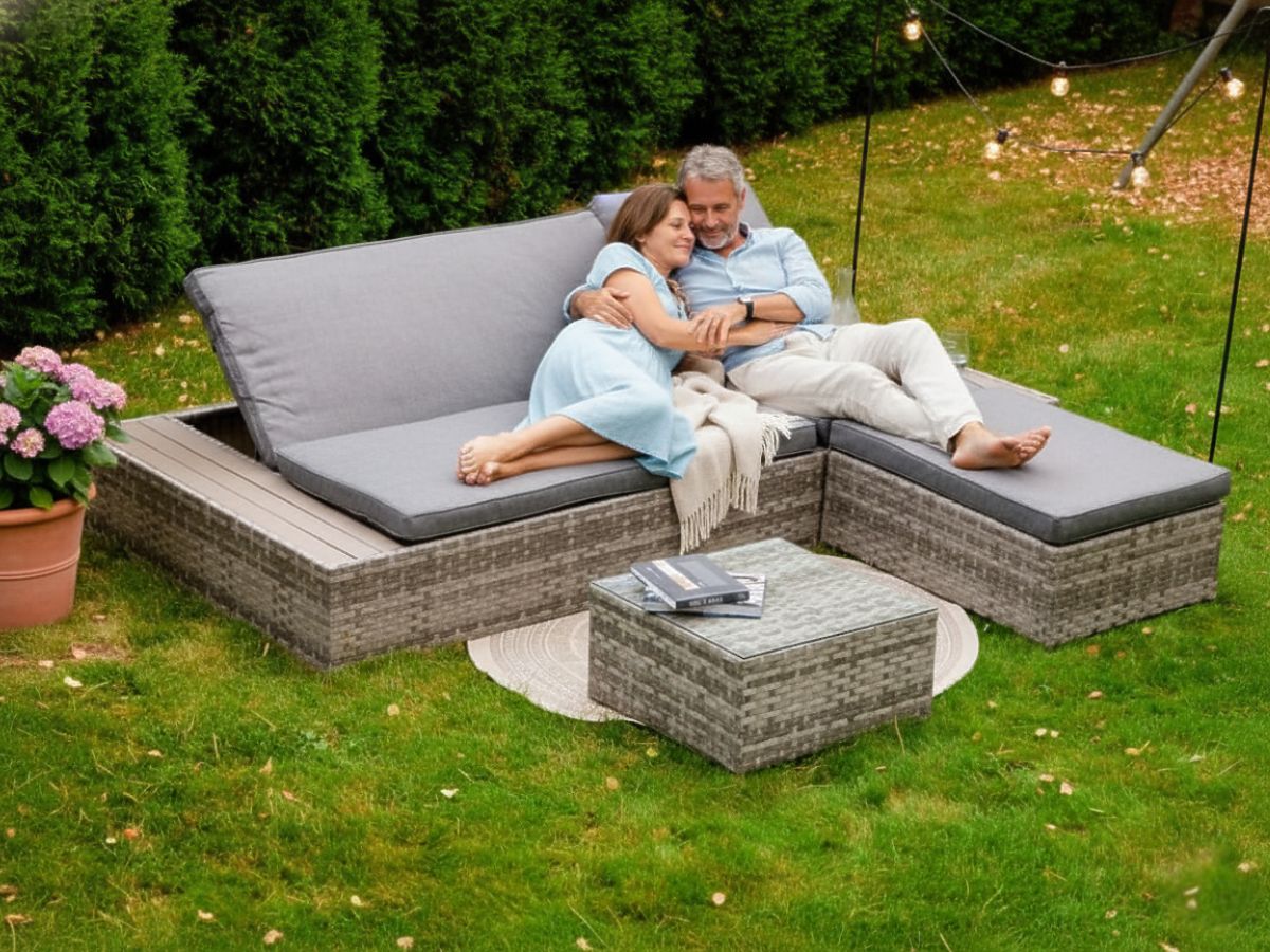 Das Gartenmöbelset DIABOLICO ist die Quintessenz von Modernität und Funktionalität und bietet eine perfekte Kombination aus hochwertigem Aluminium und Technorattan. Diese einzigartige Materialkombination gewährleistet nicht nur eine außergewöhnliche Beständigkeit der Möbel gegen Regen, Frost und extreme Temperaturen, sondern verleiht ihnen auch einen außergewöhnlichen Stil. Das Gartenmöbelset, bestehend aus einem Puff, einem Tisch und einem Bett, das auch als Sofa dienen kann, ist die perfekte Lösung für alle, die sowohl Ästhetik als auch Praktikabilität schätzen. Verstellbare Rückenlehnen ermöglichen eine schnelle und einfache Umwandlung des Sofas in ein Bett, was die Vielseitigkeit des Sets erhöht. Das Entspannungsmöbelset DIABOLICO, mit breitem Geflecht in Grautönen und elegant vollendeten Kissen, ist nicht nur ein Möbelstück, sondern auch ein Kunstwerk, das jedem Außenbereich Klasse und einzigartigen Charakter verleiht. Farbe des DIABOLICO-Sets: graumeliert, ungleichmäßiges Geflecht: Technorattan 15mm x 1,2mm, glatte Struktur Möbelkonstruktion: Aluminium Set bestehend aus 3 Elementen: 1 x Bett/Sofa: Länge: 227 cm Breite: 114 cm Höhe: 30 cm Bett für 2 Personen: 3-stufige Rückenlehnenverstellung Sofa für 3 Personen: 4-stufige Rückenlehnenverstellung Maximale Höhe bei angehobenen 3 Rückenlehnen des Sofas (vom Sitz): 42 cm 1 x Puff: Länge: 78 cm Breite: 58 cm Höhe: 30 cm 1 x Tisch (mit Glasplatte aus 5mm Sicherheitsglas): Länge: 54 cm Breite: 54 cm Höhe: 30 cm Sitzhöhe des Sofas/Bett und Puffs: 30 cm + 8 cm Kissen Das Bett wird in 1 Karton mit den Maßen 230x32x117 cm, Gewicht 35 kg geliefert. Kissen in grauer Farbe sind im Set enthalten. Alle haben abnehmbare Bezüge mit Reißverschluss, hergestellt aus Outdoor-Material (100% Polyester), die bei niedrigen Temperaturen gewaschen werden können. Die Kissenbezüge sind aus hochwertigem Stoff mit Teflonbeschichtung genäht, die sie vor Feuchtigkeit schützt. Die Kissenfüllung besteht aus hochwertigem Polsterschaum (mittelfest - T25), der Verformungen verhindert. Dicke der Kissen: 8 cm Technorattan ist widerstandsfähig gegen schädliche Witterungseinflüsse, aber um das unveränderte Aussehen der Möbel noch länger zu genießen, empfehlen wir den Kauf einer Schutzhülle. Die dunkelgraue Hülle ist einteilig und hat unten eine Kordel, die durch Metallösen gezogen ist. Alle Hüllen werden maßgeschneidert und die Lieferzeit beträgt ca. 21 Werktage. Stellen Sie sich Gartenmöbel vor, die Ihre Erwartungen in jeder Hinsicht übertreffen – von der Beständigkeit bis zum Design. Das ist BELLO GIARDINO, wo jedes Detail zählt und Luxus auf Funktionalität trifft: Unzerstörbare Qualität: Unser synthetisches Rattan garantiert, dass die Möbel jahrelang halten, ohne an Schönheit oder Haltbarkeit zu verlieren. Wetterbeständigkeit: Unsere Möbel trotzen den härtesten Wetterbedingungen, vom heißen Sonnenlicht bis zu eisigen Wintern, und bleiben dabei stets schön. Luxuriöser Komfort: Dicke, weiche Kissen laden zur Entspannung ein und bieten einen Komfort, den man anderswo schwer findet. Leichtigkeit und Stärke: Die Aluminiumkonstruktion vereint das Beste aus beiden Welten – sie ist leicht, aber äußerst stabil. Design, das verzaubert: Jedes Element unserer Möbel wurde mit Blick auf Ästhetik und Funktionalität entworfen, um in jede Umgebung zu passen. Egal, ob Sie Minimalismus lieben oder reiche, elegante Arrangements schätzen, unsere Möbel erfüllen Ihre Erwartungen, die über die Grenzen der üblichen Funktionalität und Ästhetik hinausgehen. Wir garantieren, dass selbst die anspruchsvollsten Kunden dem Komfort und Stil, den BELLO GIARDINO bietet, nicht widerstehen können. Machen Sie Ihren Garten, Ihre Terrasse oder Ihren Balkon zu einer Oase der Entspannung und Eleganz, die Sie schon immer haben wollten. Warten Sie nicht, entdecken Sie BELLO GIARDINO noch heute und verwandeln Sie Ihre Außenbereiche in Orte, von denen Sie immer geträumt haben. Kundenfotos