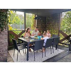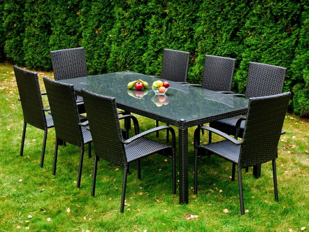 Die Gartenmöbel SOTTILE sind die ideale Lösung für diejenigen, die Eleganz, Komfort und Langlebigkeit von Gartenmöbeln schätzen. Das Ess-Set für 8 Personen bietet hervorragende Bedingungen für Treffen mit Ihren Liebsten und verbindet außergewöhnlichen Komfort mit einzigartigem Design. Jedes Element des Garten-Sets ist aus hochwertigem Technorattan gefertigt, was nicht nur seine Langlebigkeit und Wetterbeständigkeit gewährleistet, sondern auch eine einfache Pflege ermöglicht. Die hervorragende Verarbeitungspräzision unterstreicht den luxuriösen Charakter der Möbel, wodurch die Technorattan-Möbel SOTTILE zu einer wunderschönen Dekoration für jeden Außenbereich werden. Der Tisch mit den Stühlen ist regen- und UV-beständig, was garantiert, dass sie ihr ästhetisches Aussehen über viele Jahre hinweg behalten und zu einem unverzichtbaren Element jeder Garten-, Terrassen- oder Patioausstattung werden. Farbe des SOTTILE-Sets: schwarz – einheitliche, leicht gestreifte Struktur. Geflecht: Technorattan 7-8mm x 1,2mm. Möbelkonstruktion: Tisch – Aluminium, Stühle – Stahl. Das Set besteht aus 9 Elementen: 1 x Tisch: Länge: 200 cm, Breite: 100 cm, Höhe: 74 cm, Glasplatte aus 5 mm Sicherheitsglas, auf Technorattan-Geflecht gelegt. 8 x Stühle: Breite: 56 cm, Tiefe: 50 cm, Höhe: 84 cm, Sitzhöhe vom Boden: 44 cm, Rückenlehnenhöhe vom Sitz: 43 cm, Sitzbreite: 40 cm, Sitztiefe: 43 cm. Das Set wird auf 1 Palette mit den Maßen 120x80x210 cm, Gewicht 80 kg, versendet. Die Stühle sind nach dem Auspacken sofort einsatzbereit. Die Stühle sind stapelbar (können ineinander gesteckt werden), was die Lagerung erleichtert und wenig Platz beansprucht. Der Tisch ist zur einfachen, eigenständigen Montage gemäß der beiliegenden Anleitung vorgesehen. Die Glasplatte des Tisches ist auf Silikonsaugnäpfen befestigt, die sie vor dem Verrutschen schützen. Möglichkeit, Kissen für die Stühle hier zu kaufen. Technorattan ist wetterbeständig, jedoch empfehlen wir für eine noch längere Erhaltung des unveränderten Aussehens der Möbel den Kauf einer Schutzhülle. Die Abdeckung in dunkelgrauer Farbe ist einteilig und hat unten eine Kordel. Alle Abdeckungen sind maßgeschneidert und die Lieferzeit beträgt ca. 14 Werktage. Stellen Sie sich Gartenmöbel vor, die Ihre Erwartungen in jeder Hinsicht übertreffen – von der Beständigkeit bis zum Design. Das ist BELLO GIARDINO, wo jedes Detail zählt und Luxus auf Funktionalität trifft: Zeitlose Qualität: Unser synthetisches Rattan garantiert, dass die Möbel jahrelang halten, ohne an Schönheit oder Haltbarkeit zu verlieren. Wetterbeständigkeit: Unsere Möbel trotzen den härtesten Wetterbedingungen, von brennender Sonne bis zu eisigen Wintern, und bleiben dabei immer schön. Luxuriöser Komfort: Dicke, weiche Kissen laden zum Entspannen ein und bieten einen Komfort, der schwer anderswo zu finden ist. Leichtigkeit und Stärke: Die Aluminiumkonstruktion vereint das Beste aus beiden Welten – sie ist leicht, aber äußerst stabil. Design, das fasziniert: Jedes Element unserer Möbel wurde mit Blick auf Ästhetik und Funktionalität entworfen, um in jede Umgebung zu passen. Ob Sie Minimalismus lieben oder reiche, elegante Arrangements schätzen, unsere Möbel erfüllen Ihre Erwartungen und überschreiten die Grenzen gewöhnlicher Funktionalität und Ästhetik. Wir versichern, dass selbst die anspruchsvollsten Kunden dem Komfort und Stil, den BELLO GIARDINO bietet, nicht widerstehen können. Machen Sie Ihren Garten, Ihre Terrasse oder Ihren Balkon zu einer Oase der Entspannung und Eleganz, die Sie schon immer haben wollten. Warten Sie nicht, entdecken Sie BELLO GIARDINO noch heute und verwandeln Sie Ihre Außenbereiche in Orte, von denen Sie immer geträumt haben. Fotos von Möbeln von unseren Kunden: