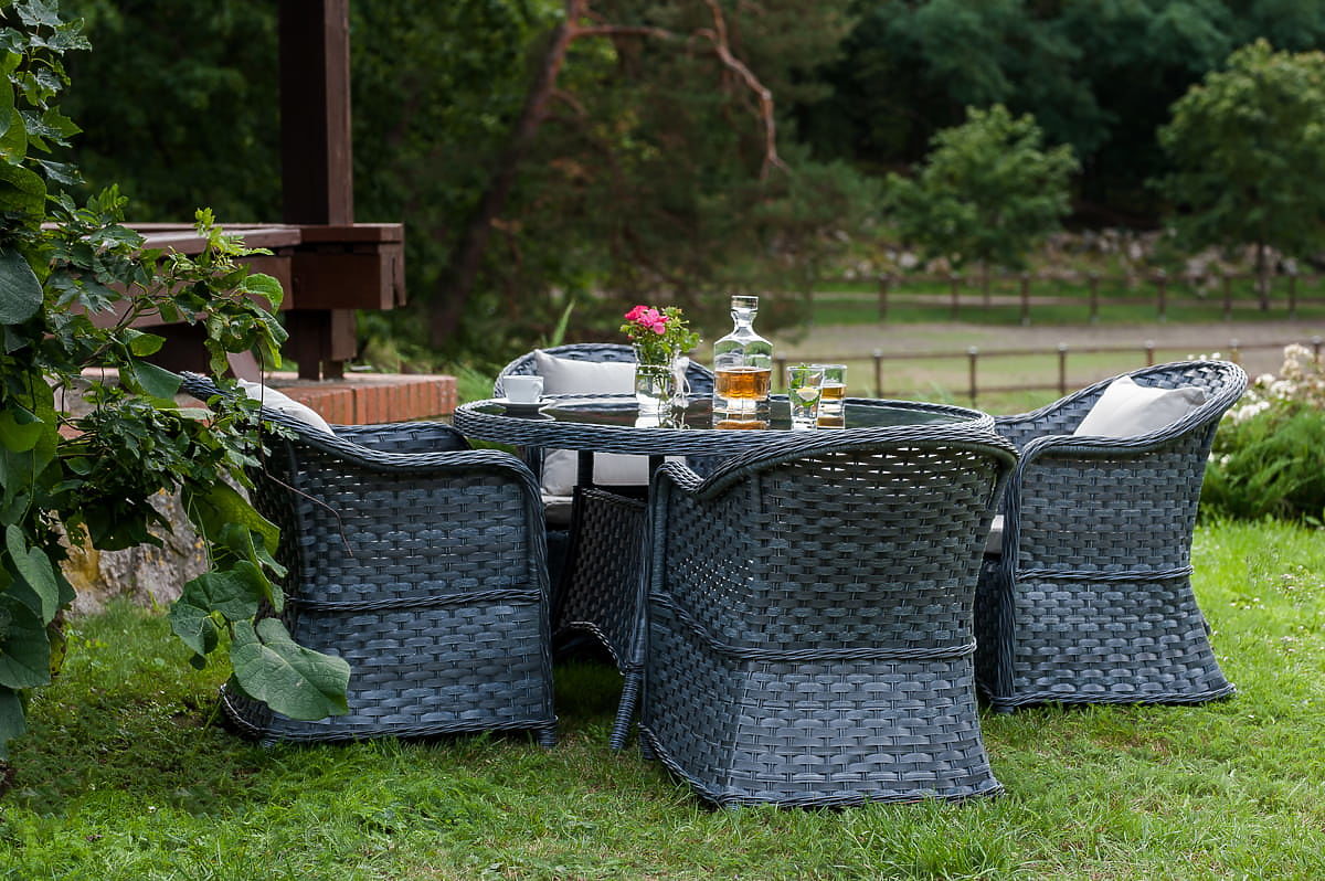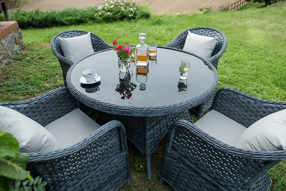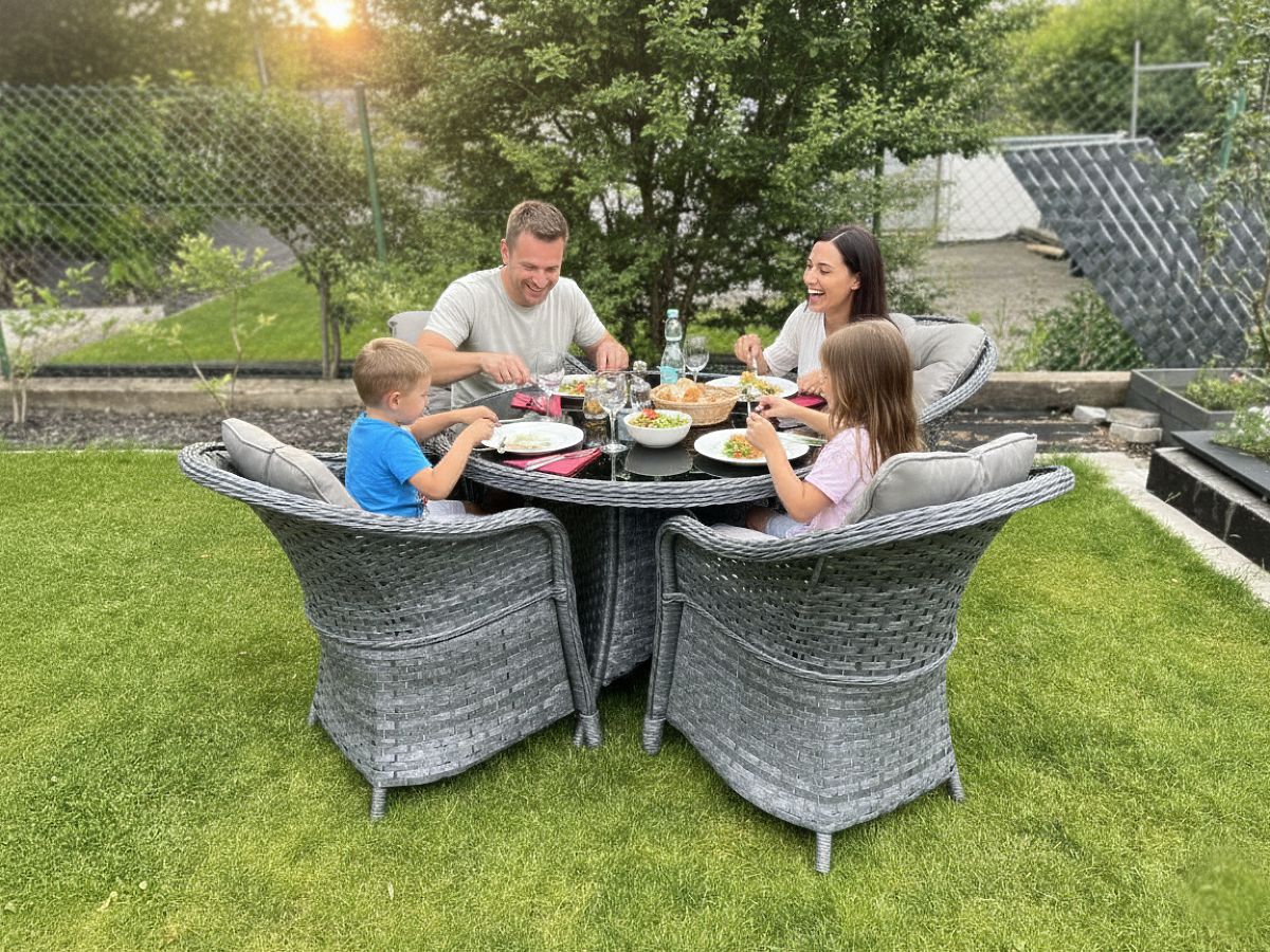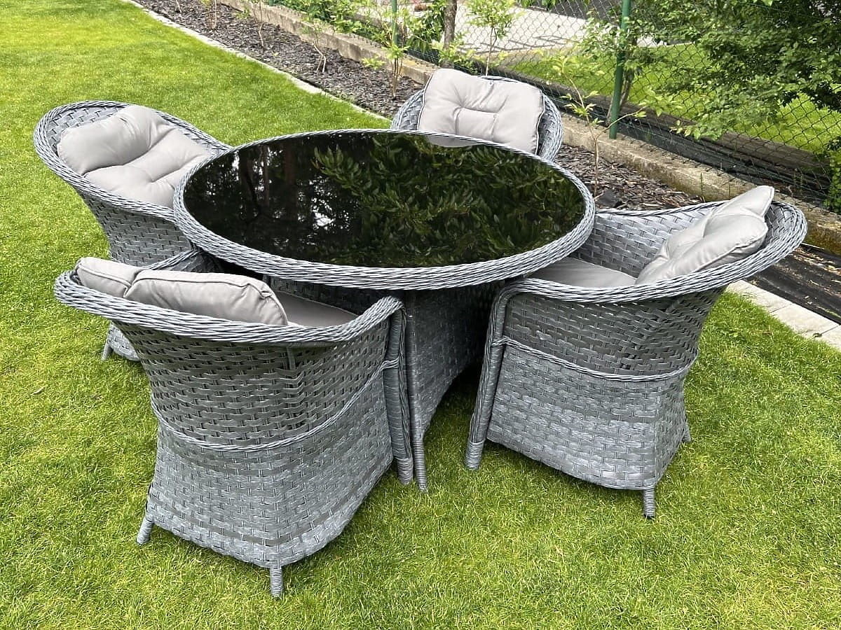 Die Essgruppe MODERNO ist die Quintessenz modernen Designs und eines innovativen Ansatzes für die Innenausstattung. Sie präsentiert ein originelles Design, das sich von Standardlösungen abhebt und nicht nur Ästhetik, sondern auch unvergleichliche Haltbarkeit dank der Verwendung von hochwertigem synthetischem Rattan bietet. Die absolute Wetterbeständigkeit macht dieses Set zur idealen Wahl sowohl für Innenräume als auch für Außenbereiche. Mit der Wahl des MODERNO-Sets investieren Sie in Möbel, die nicht nur schön aussehen, sondern auch für eine langjährige Nutzung ausgelegt sind und die Erwartungen der anspruchsvollsten Kunden erfüllen, die eine einzigartige Verbindung von Funktionalität, Haltbarkeit und modernem Stil suchen. Farbe des Sets: graue Melange, ungleichmäßig. Farbe der Kissen: dunkelgrau. Geflecht: flaches Technorattan 17 mm x 1,2 mm und rundes Technorattan, glatte Struktur. Konstruktion: Stahl. Set bestehend aus 5 Elementen: 4 x Sessel: Breite: 56 cm, Tiefe: 70 cm, Höhe: 81 cm. 1 x Tisch (mit schwarzer Glasplatte aus 5 mm Sicherheitsglas): Durchmesser: 120 cm, Höhe: 74 cm. Weitere Abmessungen: Sitzhöhe des Sessels: 38 cm + 5 cm Kissen. Höhe der Rückenlehne ab Sitz: 50 cm. Breite der Armlehnen und Rückenlehne: 5 cm. Sitzbreite und -tiefe: 52 x 52 cm. Das Set wird auf 1 Palette mit den Maßen 120x100x210 cm geliefert, Gewicht 70 kg. Kissen in dunkelgrau für die Sitze im Setpreis enthalten (4 Stück). Alle haben abnehmbare Bezüge mit Reißverschluss, aus Outdoor-Material (100% Polyester), die bei niedrigen Temperaturen waschbar sind. Die Kissenbezüge sind aus hochwertigem Stoff genäht, der mit Teflon beschichtet ist, um sie vor Feuchtigkeit zu schützen. Die Kissenfüllung besteht aus hochwertigem Polsterschaum (mittlere Härte - T25), der Verformungen verhindert. Dicke der Kissen: 5 cm. Möglichkeit der Anfertigung von Kissen nach individueller Bestellung für dieses Set: https://www.bg-meble.pl/pl/p/Usluga-Krawiecka-Poduszki-Na-Zamowienie-/742 Möglichkeit der Anfertigung von Kissenbezügen nach individueller Bestellung für dieses Set: https://www.bg-meble.pl/pl/p/Usluga-Krawiecka-Poszewki-Na-Zamowienie/743 Für eine längere Erhaltung des unveränderten Aussehens der Möbel empfehlen wir den Kauf einer Schutzabdeckung. Die Abdeckung in dunkelgrau ist einteilig und hat an der Unterseite eine Kordel zum Zuziehen. Alle Abdeckungen werden maßgefertigt und die Lieferzeit beträgt ca. 14 Arbeitstage. Stellen Sie sich Gartenmöbel vor, die Ihre Erwartungen in jeder Hinsicht übertreffen – von der Haltbarkeit bis zum Design. Das ist BELLO GIARDINO, wo jedes Detail zählt und Luxus auf Funktionalität trifft: Zeitlose Qualität: Unser synthetisches Rattan garantiert, dass die Möbel jahrelang halten, ohne an Schönheit oder Haltbarkeit zu verlieren. Wetterbeständigkeit: Unsere Möbel trotzen den härtesten Wetterbedingungen, vom sengenden Sonnenlicht bis zu eisigen Wintern, und bleiben dabei immer schön. Luxuriöser Komfort: Dicke, weiche Kissen laden zur Entspannung ein und bieten einen Komfort, der schwer anderswo zu finden ist. Leichtigkeit und Stärke: Die Aluminiumkonstruktion vereint das Beste aus beiden Welten – sie ist leicht, aber äußerst stabil. Design, das bezaubert: Jedes Element unserer Möbel wurde mit Blick auf Ästhetik und Funktionalität entworfen, um in jede Umgebung zu passen. Egal, ob Sie Minimalismus lieben oder reichhaltige, elegante Arrangements schätzen, unsere Möbel erfüllen Ihre Erwartungen und überschreiten die Grenzen gewöhnlicher Funktionalität und Ästhetik. Wir garantieren, dass selbst die anspruchsvollsten Kunden dem Komfort und Stil, den BELLO GIARDINO bietet, nicht widerstehen können. Machen Sie Ihren Garten, Ihre Terrasse oder Ihren Balkon zu einer Oase der Entspannung und Eleganz, die Sie sich schon immer gewünscht haben. Warten Sie nicht, entdecken Sie BELLO GIARDINO noch heute und verwandeln Sie Ihre Außenbereiche in Orte, von denen Sie immer geträumt haben. Fotos von unseren Kunden.