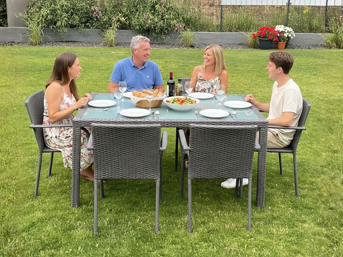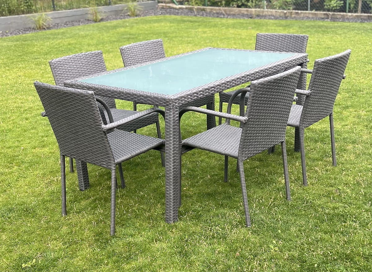 Das Essmöbel-Set AVVICENTE wurde für Liebhaber stilvoller, aber gleichzeitig praktischer Lösungen entworfen und ist die perfekte Ergänzung für jeden Außenbereich. Die leichte Konstruktion des Tisches ermöglicht ein einfaches Umstellen, was außergewöhnliche Vielseitigkeit bietet und die Anpassung der Anordnung an individuelle Bedürfnisse ermöglicht. Gartenmöbel aus Technorattan bestechen nicht nur durch ihre Eleganz, sondern garantieren auch Beständigkeit gegen Regen, starke Sonneneinstrahlung und Frost, wodurch der Bedarf an intensiver Pflege entfällt. Zudem bieten die bequemen Stühle maximalen Komfort, was jeden Moment im Freien noch angenehmer macht. Das Gartenmöbel-Set AVVICENTE ist ein Synonym für Langlebigkeit und Eleganz und erfüllt perfekt die Bedürfnisse moderner Nutzer, die nach Möbeln suchen, die jahrelang halten. Farbe des AVVICENTE-Sets: grau, gebürstete Struktur Geflecht: Technorattan 7-8mm x 1,2mm Möbelkonstruktion: Tisch - Aluminium, Stühle - Stahl Das Set besteht aus 7 Elementen: 1 x Tisch (mit einer matten Glasplatte aus 5mm Sicherheitsglas): Länge: 150 cm Breite: 90 cm Höhe: 74 cm 6 x Stühle: Breite: 56 cm Tiefe: 50 cm Höhe: 84 cm Sitzhöhe vom Boden: 44 cm Rückenlehnenhöhe vom Sitz: 43 cm Sitzbreite: 40 cm Sitztiefe: 43 cm Das Set wird auf 1 Palette mit den Maßen 120x80x170 cm, Gewicht 60 kg, versendet. Möglichkeit, Kissen für die Stühle hier zu kaufen. Die Stühle können nach dem Auspacken sofort verwendet werden. Die Stühle sind stapelbar (können ineinander gestellt werden), was die Lagerung erleichtert und die Möbel nehmen nicht viel Platz ein. Der Tisch ist zur einfachen, eigenständigen Montage gemäß der beiliegenden Anleitung vorgesehen. Die matte Glasplatte des Tisches ist in den Technorattan-Rahmen eingebaut. Technorattan ist beständig gegen schädliche Witterungseinflüsse, jedoch empfehlen wir, für eine noch längere Erhaltung des unveränderten Aussehens der Möbel eine Schutzhülle zu kaufen. Die Hülle in dunkelgrauer Farbe ist einteilig und hat unten eine Kordel. Alle Hüllen werden maßgeschneidert und die Lieferzeit beträgt ca. 14 Werktage. Stellen Sie sich Gartenmöbel vor, die Ihre Erwartungen in jeder Hinsicht übertreffen – von der Beständigkeit bis zum Design. Das ist BELLO GIARDINO, wo jedes Detail zählt und Luxus auf Funktionalität trifft: Unveränderte Qualität: Unser synthetisches Rattan garantiert, dass die Möbel jahrelang halten, ohne an Schönheit oder Haltbarkeit zu verlieren. Wetterbeständigkeit: Unsere Möbel trotzen den härtesten Wetterbedingungen, von brennender Sonne bis zu eisigen Wintern, und bleiben dennoch schön. Luxuriöser Komfort: Dicke, weiche Kissen laden zur Entspannung ein und bieten Komfort, der schwer anderswo zu finden ist. Leichtigkeit und Stabilität: Die Aluminiumkonstruktion vereint das Beste aus beiden Welten – sie ist leicht, aber äußerst stabil. Design, das verzaubert: Jedes Element unserer Möbel wurde mit Blick auf Ästhetik und Funktionalität entworfen, um in jede Umgebung zu passen. Ob Sie Minimalismus lieben oder reiche, elegante Arrangements schätzen, unsere Möbel erfüllen Ihre Erwartungen und überschreiten die Grenzen gewöhnlicher Funktionalität und Ästhetik. Wir garantieren, dass selbst die anspruchsvollsten Kunden dem Komfort und Stil, den BELLO GIARDINO bietet, nicht widerstehen können. Machen Sie Ihren Garten, Ihre Terrasse oder Ihren Balkon zu einer Oase der Entspannung und Eleganz, die Sie schon immer haben wollten. Warten Sie nicht, entdecken Sie BELLO GIARDINO noch heute und verwandeln Sie Ihre Außenbereiche in Orte, von denen Sie immer geträumt haben. Fotos von Möbeln unserer Kunden:
