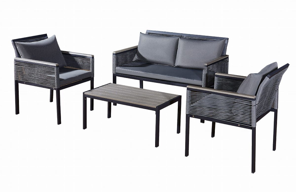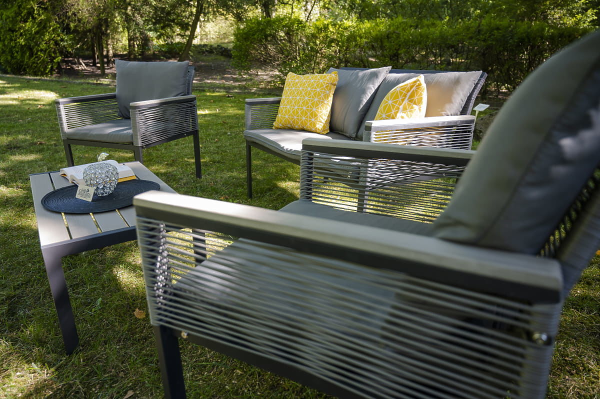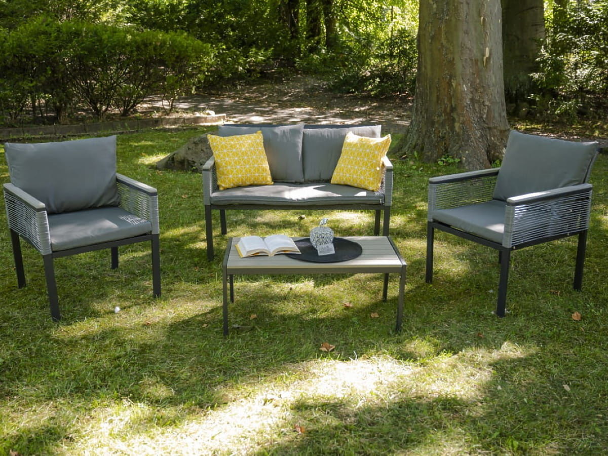 Luka-home.de   »   Gartenmöbel   /   Gartensets   /   Aluminium-Gartenmöbel-Set (2 x Sessel, Sofa + Tisch) CORTO runder grauer Technorattan