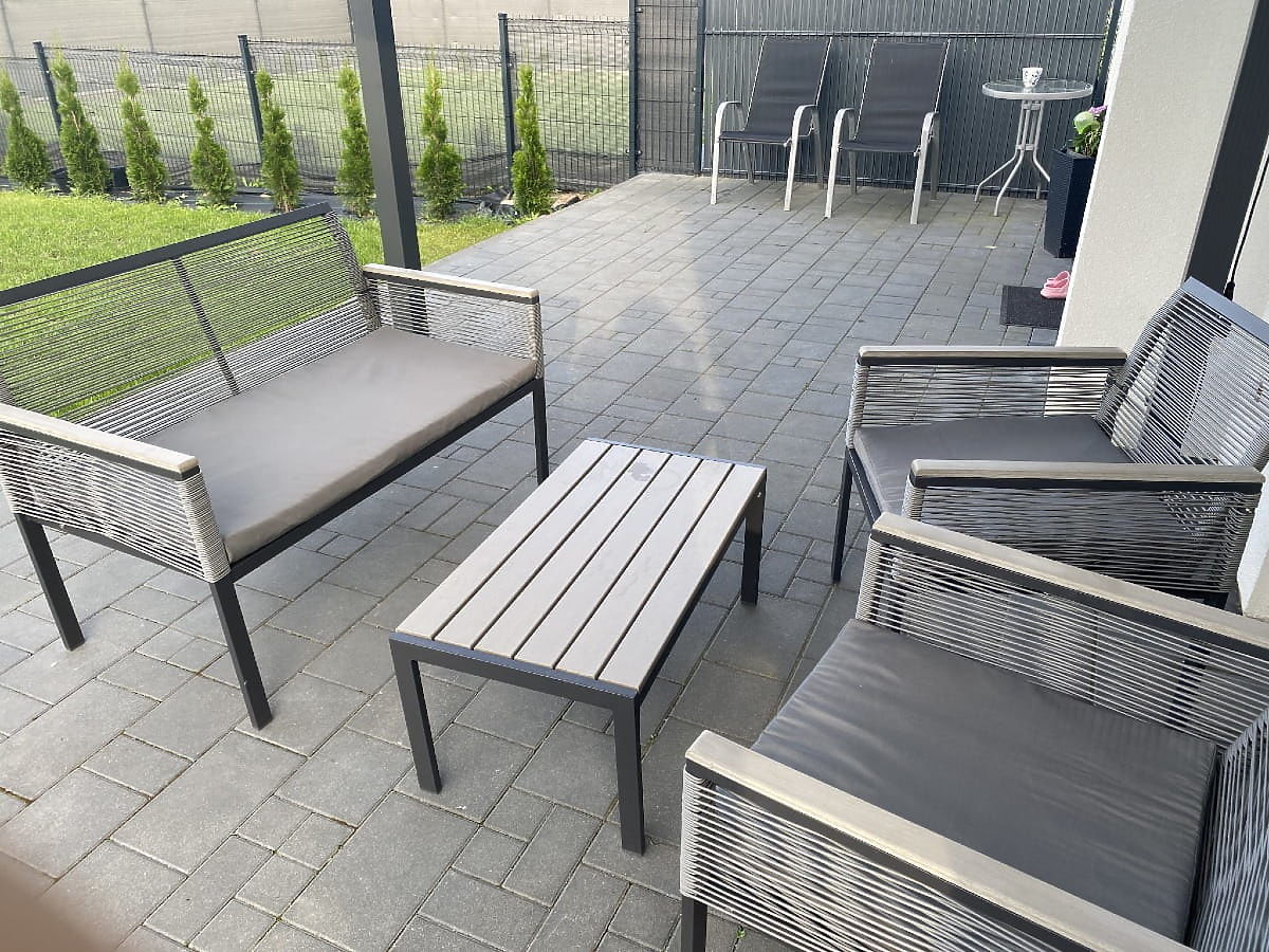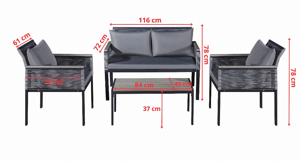 Das CORTO Möbelset wurde mit Blick auf maximalen Komfort und Ästhetik entworfen. Es ist die perfekte Wahl für diejenigen, die ihrem Garten, ihrer Terrasse oder ihrem Balkon einen einzigartigen Charakter verleihen möchten. Die Gartenmöbel CORTO bieten eine Verbindung von luxuriösem Komfort mit klassischem Design, dieses Set ist nicht nur bequem, sondern auch äußerst funktional und nimmt wenig Platz ein. Diese Balkonmöbel haben ein hochwertiges Geflecht aus synthetischem Rattan, das Beständigkeit gegen schädliche Witterungseinflüsse gewährleistet und gleichzeitig eine langfristige Nutzung ohne Verlust des ästhetischen Aussehens garantiert. Das Balkonmöbelset Corto ist die ideale Lösung für alle, die Eleganz, Langlebigkeit und komfortable Entspannung im Freien schätzen und gleichzeitig eine stilvolle Ergänzung für jede Außengestaltung suchen. Farbe des CORTO Sets: Schwarz, einheitlich Geflecht: runder Technorattan Möbelkonstruktion: Aluminium (einfache Montage erforderlich) Armlehnen mit Polywood abgeschlossen Das Set besteht aus 4 Elementen (nach der Montage): 2 x Sessel: Breite: 61 cm Tiefe: 72 cm Höhe: 78 cm 1 x Sofa: Breite: 116 cm Tiefe: 72 cm Höhe: 78 cm 1 x Tisch (Polywood-Platte): Länge: 84 cm Breite: 45 cm Höhe: 37 cm Kissen in grauer Farbe im Set enthalten (3 Stück für Sitzflächen, 4 Stück für Rückenlehnen). Alle haben abnehmbare Bezüge mit Reißverschluss, hergestellt aus Outdoor-Material (100% Polyester), die bei niedrigen Temperaturen gewaschen werden können. Die Kissenbezüge sind aus hochwertigem Stoff mit Teflonbeschichtung genäht, die sie vor Feuchtigkeit schützt. Die Kissenfüllung besteht aus hochwertigem Polsterschaum (mittlere Härte - T25), der Verformungen verhindert. Dicke der Kissen: 5 cm Möglichkeit, Kissen nach individueller Bestellung für dieses Set zu nähen: https://www.bg-meble.pl/pl/p/Usluga-Krawiecka-Poduszki-Na-Zamowienie-/742 Möglichkeit, Kissenbezüge nach individueller Bestellung für dieses Set zu nähen: https://www.bg-meble.pl/pl/p/Usluga-Krawiecka-Poszewki-Na-Zamowienie/743 Möglichkeit, nur das komplette Set zu bestellen. Set zur Selbstmontage gemäß der beigefügten Anleitung. Zum Set gehört ein vollständiges Schrauben- und Schlüsselsatz. Technorattan ist beständig gegen schädliche Witterungseinflüsse, aber für eine noch längere Erhaltung des unveränderten Aussehens der Möbel empfehlen wir den Kauf einer Schutzhülle. Die Hülle in dunkelgrauer Farbe ist einteilig und hat unten eine Kordel mit Metallösen. Alle Hüllen werden auf Bestellung genäht und die Lieferzeit beträgt ca. 14 Werktage. Stellen Sie sich Gartenmöbel vor, die Ihre Erwartungen in jeder Hinsicht übertreffen – von der Haltbarkeit bis zum Design. Hier ist BELLO GIARDINO, wo jedes Detail zählt und Luxus auf Funktionalität trifft: Unvergängliche Qualität: Unser synthetisches Rattan garantiert, dass die Möbel jahrelang halten, ohne an Schönheit oder Haltbarkeit zu verlieren. Wetterbeständigkeit: Unsere Möbel trotzen den härtesten Wetterbedingungen, von sengender Sonne bis zu eisigen Wintern, und bleiben dabei immer schön. Luxuriöser Komfort: Dicke, weiche Kissen laden zur Entspannung ein und bieten Komfort, den man anderswo schwer findet. Leichtigkeit und Beständigkeit: Die Aluminiumkonstruktion vereint das Beste aus beiden Welten – sie ist leicht, aber äußerst stabil. Design, das begeistert: Jedes Element unserer Möbel wurde mit Blick auf Ästhetik und Funktionalität entworfen, um in jede Umgebung zu passen. Ob Sie Minimalismus lieben oder reiche, elegante Anpassungen schätzen, unsere Möbel erfüllen Ihre Erwartungen, überschreiten die Grenzen gewöhnlicher Funktionalität und Ästhetik. Wir garantieren, dass selbst die anspruchsvollsten Kunden dem Komfort und Stil, den BELLO GIARDINO bietet, nicht widerstehen können. Machen Sie Ihren Garten, Ihre Terrasse oder Ihren Balkon zu einer Oase der Entspannung und Eleganz, die Sie schon immer haben wollten. Warten Sie nicht, entdecken Sie BELLO GIARDINO noch heute und verwandeln Sie Ihre Außenbereiche in Orte, von denen Sie immer geträumt haben.