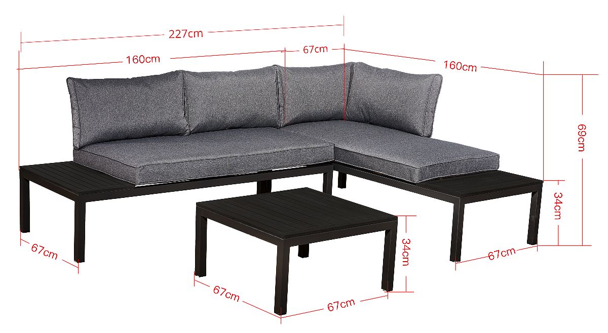 VENTO ist eine Investition in Langlebigkeit und Komfort. Hergestellt aus hochwertigem, wetterbeständigem Stahl, wird dieses Set Ihnen viele Jahre dienen. Weiche Kissen und ergonomische Form sorgen für Komfort bei der Entspannung. Die ideale Wahl für diejenigen, die praktische Lösungen schätzen. Farbe des VENTO-Sets: schwarz Kissenfarbe: grau Möbelkonstruktion: stahl Das Ecksofa ist modular, was eine Anpassung in beliebiger Konfiguration (links/rechts) ermöglicht. Das Set besteht aus 3 Elementen: 2 x Seitenmodul (rechts und links): Breite: 160 cm Tiefe: 67 cm Höhe: 69 cm 1 x Tisch: Länge: 67 cm Breite: 67 cm Höhe: 34 cm Graue Kissen für Sitzflächen und Rückenlehnen sind im Set enthalten (2 Stk. für Sitzflächen, 4 Stk. für Rückenlehnen). Dicke der Sitzkissen: 8 cm. Stellen Sie sich Gartenmöbel vor, die in jeder Hinsicht Ihre Erwartungen übertreffen – von der Haltbarkeit bis zum Design. Dies ist BELLO GIARDINO, wo jedes Detail zählt und Luxus auf Funktionalität trifft: Zeitlose Qualität: Unser synthetisches Rattan garantiert, dass die Möbel jahrelang halten, ohne an Schönheit oder Haltbarkeit zu verlieren. Wetterbeständigkeit: Unsere Möbel trotzen den härtesten Wetterbedingungen, von sengender Sonne bis zu eisigen Wintern, und bleiben dabei stets schön. Luxuriöser Komfort: Dicke, weiche Kissen laden zur Entspannung ein und bieten Komfort, den man anderswo schwer findet. Leichtigkeit und Stabilität: Die Aluminiumkonstruktion vereint das Beste aus beiden Welten – sie ist leicht, aber äußerst stabil. Design, das beeindruckt: Jedes Element unserer Möbel wurde mit Blick auf Ästhetik und Funktionalität entworfen, um in jede Umgebung zu passen. Ob Sie Minimalismus lieben oder reiche, elegante Arrangements schätzen, unsere Möbel erfüllen Ihre Erwartungen, die über die Grenzen gewöhnlicher Funktionalität und Ästhetik hinausgehen. Wir stellen sicher, dass selbst die anspruchsvollsten Kunden dem Komfort und Stil von BELLO GIARDINO nicht widerstehen können. Machen Sie Ihren Garten, Ihre Terrasse oder Ihren Balkon zu einer Oase der Entspannung und Eleganz, die Sie sich schon immer gewünscht haben. Warten Sie nicht, entdecken Sie BELLO GIARDINO noch heute und verwandeln Sie Ihre Außenbereiche in Orte, von denen Sie immer geträumt haben.