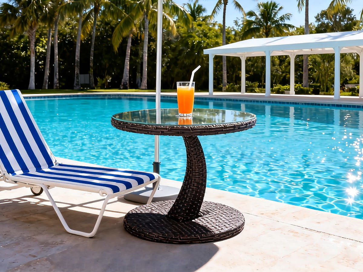 Ergänzen Sie Ihre Entspannungszone mit einem praktischen und stilvollen Gartentisch. Dieses kompakte Möbelstück ist der ideale Begleiter für Ihre Liege, Ihren Sessel oder Ihr Gartensofa. Dank seines universellen Designs eignet es sich hervorragend für den Balkon, die Terrasse oder sogar für eine kleine Kaffee-Ecke im Garten. Der Tisch zeichnet sich durch eine stabile Konstruktion aus. Die Verwendung von Alu-Rattan-Technologie gewährleistet, dass das Möbelstück nicht nur robust und stabil, sondern auch vollständig witterungsbeständig und leicht zu reinigen ist. Seine runde Tischplatte mit einem optimalen Durchmesser von 50 cm bietet ausreichend Platz für eine Tasse Kaffee, ein Buch oder ein Telefon, und die Höhe von 43 cm garantiert einen bequemen Zugang von der Höhe der meisten Entspannungsmöbel. Technische Spezifikation: Möbeltyp: Couchtisch Material: Alu-Rattan (Aluminiumkonstruktion mit Rattanoberfläche) Abmessungen: Durchmesser: 50 cm Höhe: 43 cm Konstruktion: Aluminium mit Abmessungen von 25x11x1,1 mm und 18x18x1,1 mm Oberfläche (Rattan): Geflecht mit Abmessungen von 7,5x1,3 mm Montagetyp: KD (Konstruktion zur Selbstmontage/Demontage) Mit der Wahl unseres Tisches erhalten Sie nicht nur ein funktionales Möbelstück, sondern auch ein elegantes Accessoire, das den Charakter Ihres Außenbereichs unterstreicht. Seine Langlebigkeit und zeitlose Optik machen ihn zu einer Investition für viele Saisons. Genießen Sie Komfort und Stil in jedem Detail Ihres Gartens.
