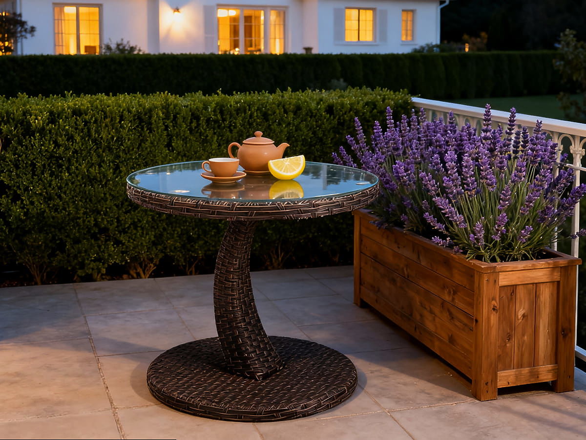 Runder Balkon-Tisch aus Technorattan für stilvolle Entspannungszonen. .. mehr
