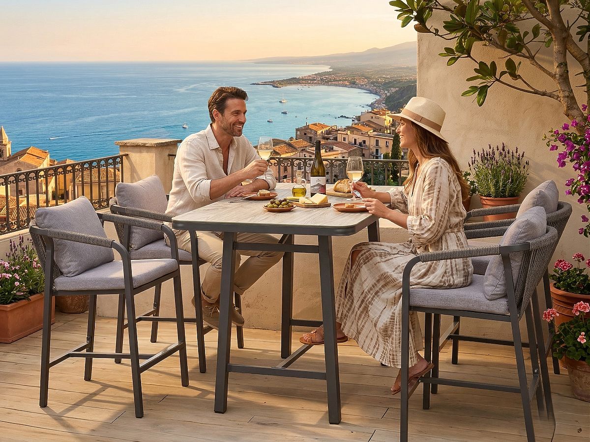 ERWARTETE LIEFERUNG ANFANG APRIL 2026 Das BREZZA Möbelset ist ein außergewöhnliches Angebot für diejenigen, die eine moderne, clubartige Atmosphäre in ihren Garten, auf die Terrasse oder das Patio bringen möchten. Dieses exklusive Set zeichnet sich durch eine untypische Form für Gartenmöbel aus – es besteht aus einem hohen Bartisch und vier bequemen Barhockern. Es ist die perfekte Lösung für Sommerabende mit Drinks, Snacks oder entspannten Gesprächen unter Freunden. Der mehrschichtige Sitz mit Schaumstoff in geeigneter Dichte und die weiche Rückenlehne sorgen dafür, dass auch hohe Stühle zum Synonym für Entspannung werden. Die große Tischplatte mit den Maßen 150 x 90 cm bietet viel Platz für Geschirr und Dekorationen und schafft so den zentralen Punkt jeder Outdoor-Party. Technische Spezifikation: Modellname: BREZZA Settyp: Bar-Set (hoher Tisch + 4 Barhocker) Tischmaße: Länge: 150 cm Breite: 90 cm Höhe: 101 cm Maße des Barhockers: Breite: 60 cm Tiefe: 64 cm Höhe: 99 cm Kissen: Sitz: Dicke 5 cm, mehrschichtige Konstruktion für Haltbarkeit und Komfort (1 cm Polypropylen 350 g + 3 cm Schaumstoff/Gummi 20D + 1 cm Polypropylen 350 g). Rückenlehne: Füllung aus weicher Baumwolle PP, die sich perfekt dem Rücken anpasst. Mit der Wahl des BREZZA Sets setzen Sie auf einen ungewöhnlichen Stil und Funktionalität, die den Charakter Ihres Außenbereichs verändern. Es sind Möbel, die dazu einladen, Zeit an der frischen Luft zu verbringen und die Freiheit der Bar-Atmosphäre mit häuslichem Komfort verbinden. Schaffen Sie Ihre private Entspannungszone, die Gäste begeistert und zum Lieblingsplatz für Sommertreffen wird.