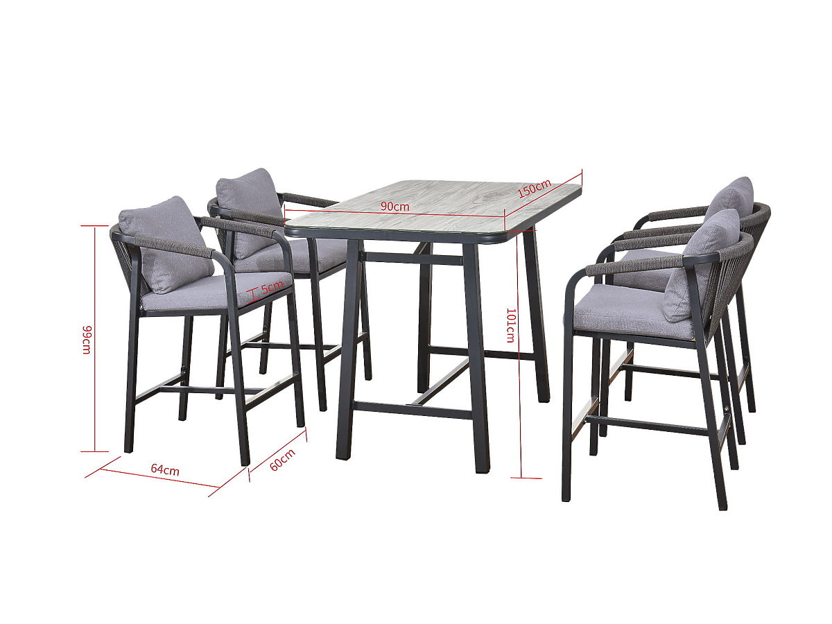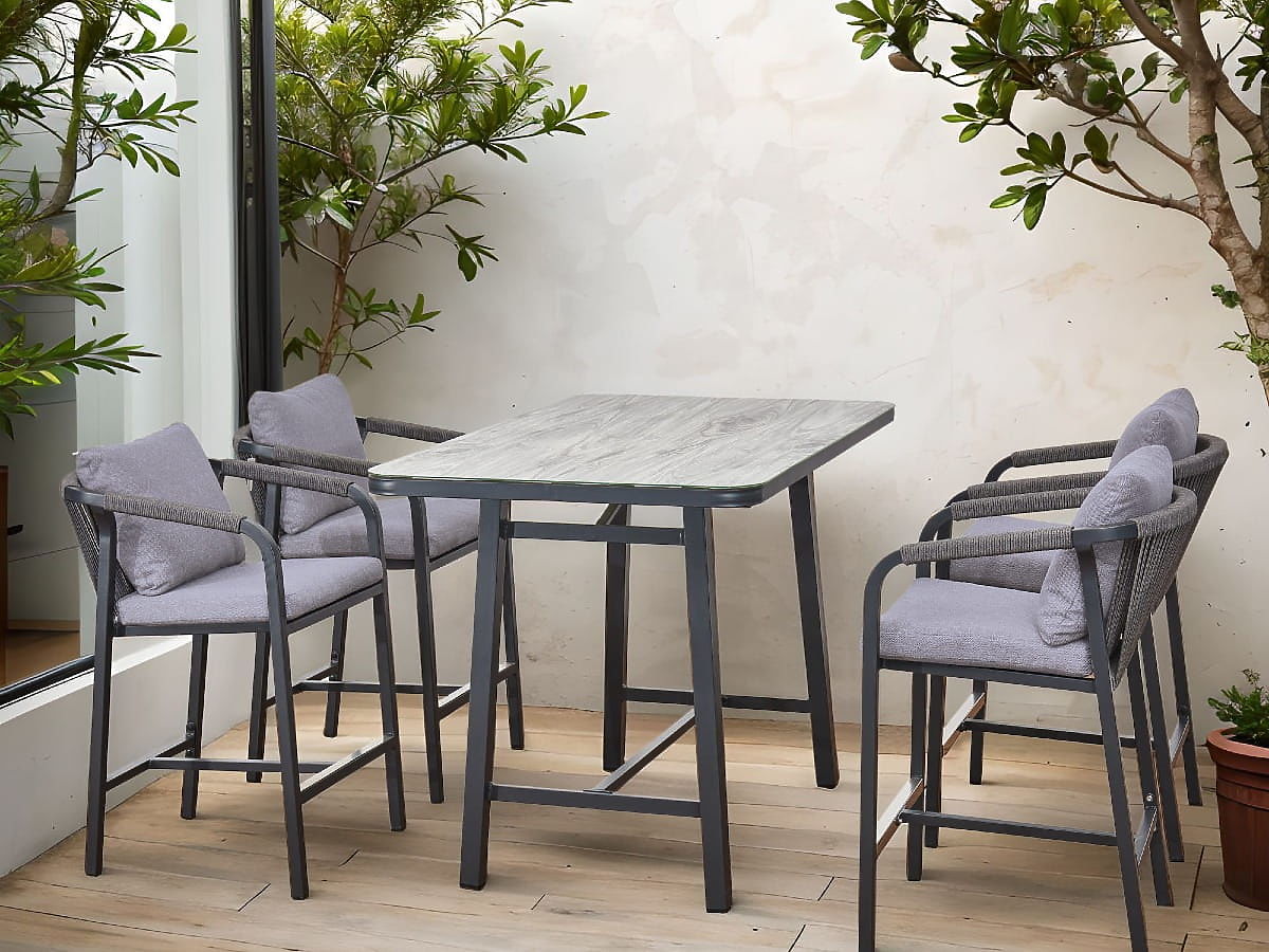 Luka-home.de   »   Gartenmöbel   /   Gartensets   /   Gartenmöbelset (4 Barhocker + hoher Tisch) BREZZA grau