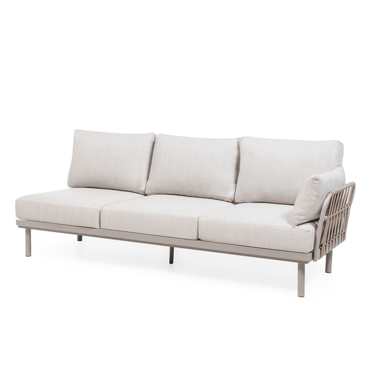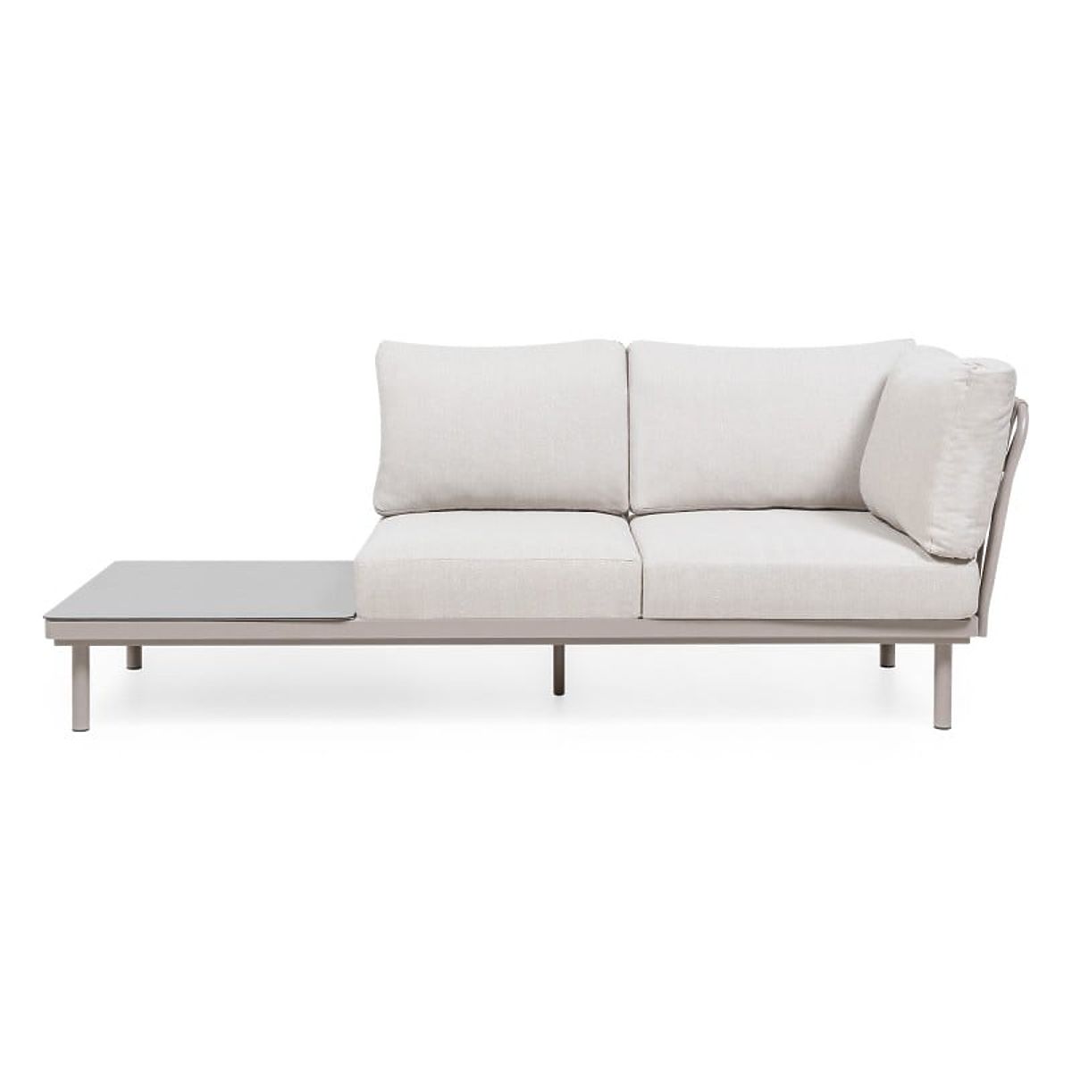 Ecksofa Amarello – sanfte Eleganz in harmonischer Form. Die Aluminiumkonstruktion in beigegrauem Ton, das strapazierfähige Geflecht und die bequemen Kissen schaffen einen anspruchsvollen Raum zur Entspannung, ergänzt durch einen praktischen Tisch und ein seitliches Regal.