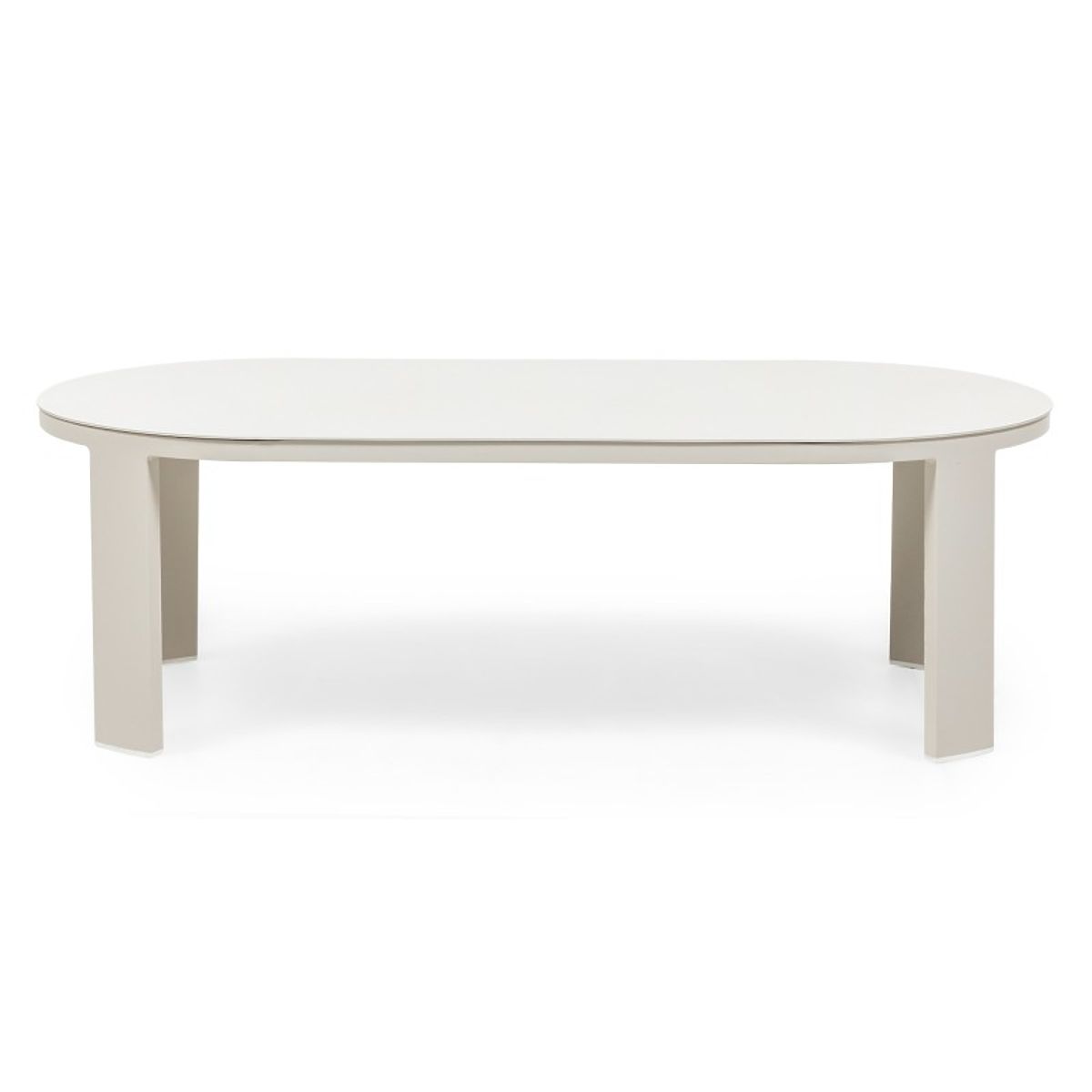 Japori vereint Ruhe und Eleganz in einem Set. Die leichte, hellbeige Konstruktion und die abgerundeten Formen verleihen dem Raum einen gemütlichen Charakter, während die weichen Kissen und der ovale Couchtisch zu stilvollen Momenten der Entspannung einladen.