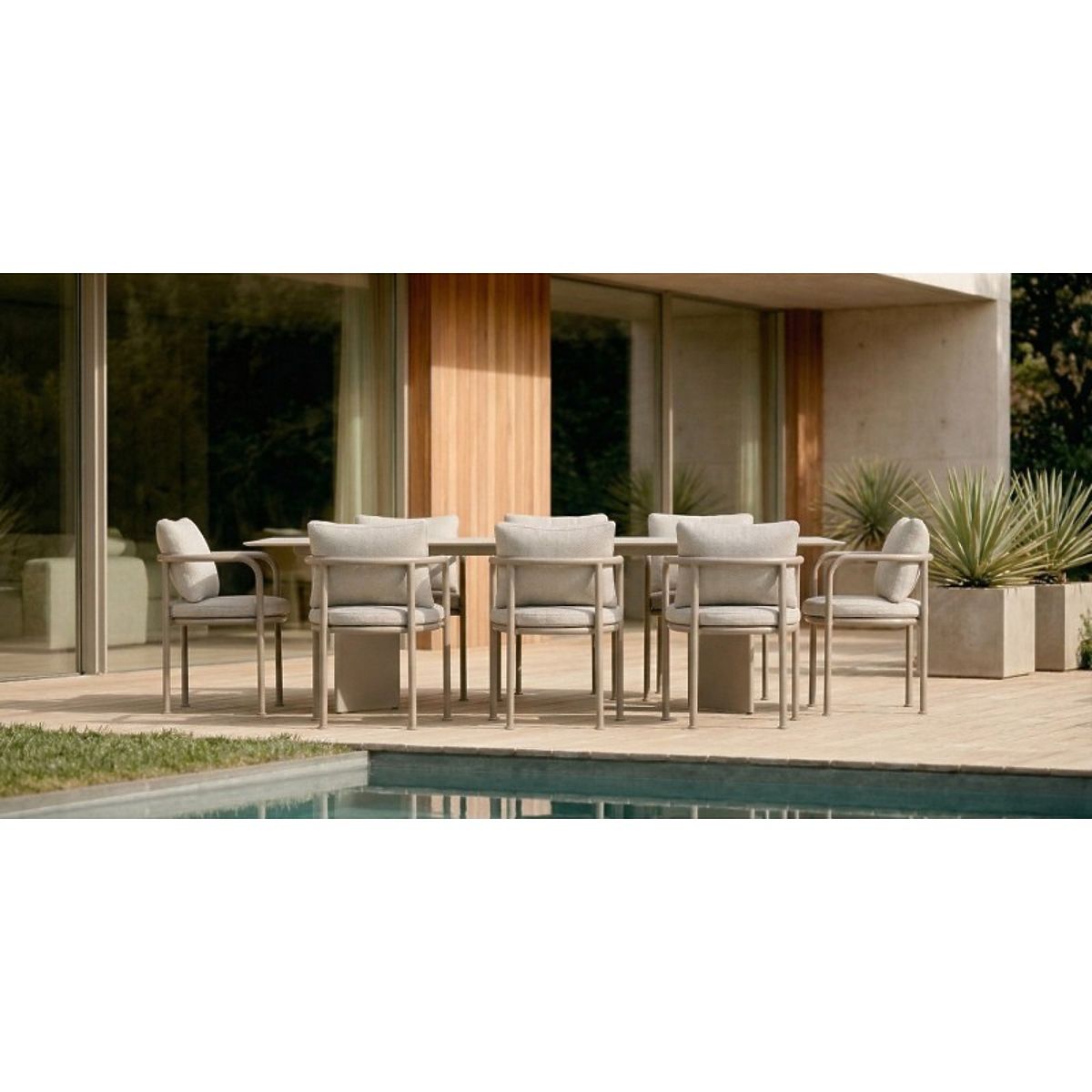 Der Tisch Amarello fügt sich sanft in den Raum ein und verkörpert Eleganz in minimalistischer Form. Die stabile, aber dennoch leichte Aluminiumkonstruktion bietet Komfort und Stil und wird zu einem außergewöhnlichen Detail, das jede Gartengestaltung ergänzt.