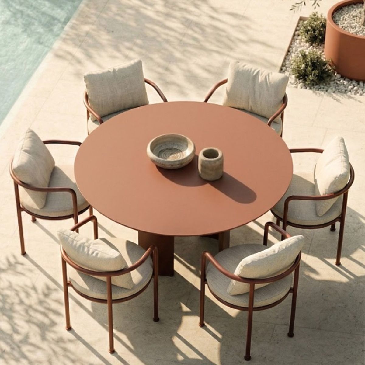 Runder, weinbrauner Gartentisch aus Aluminium mit 140 cm Durchmesser. .. mehr