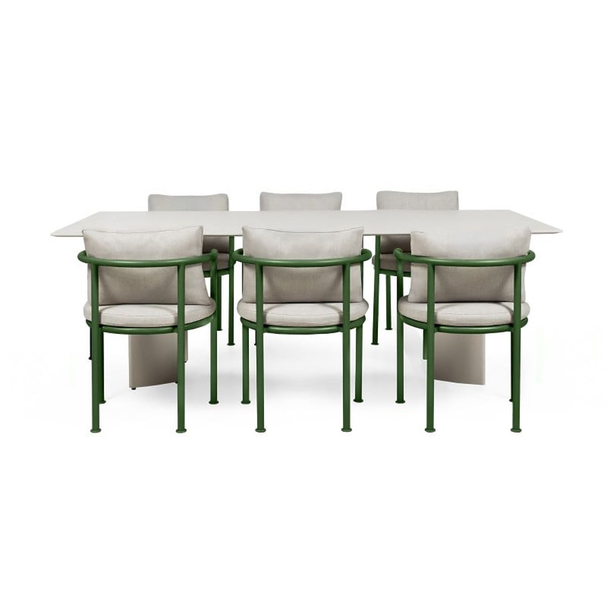 Aluminium-Garten-Set mit hellbeigem Tisch und 6 grünen Stühlen. .. mehr
