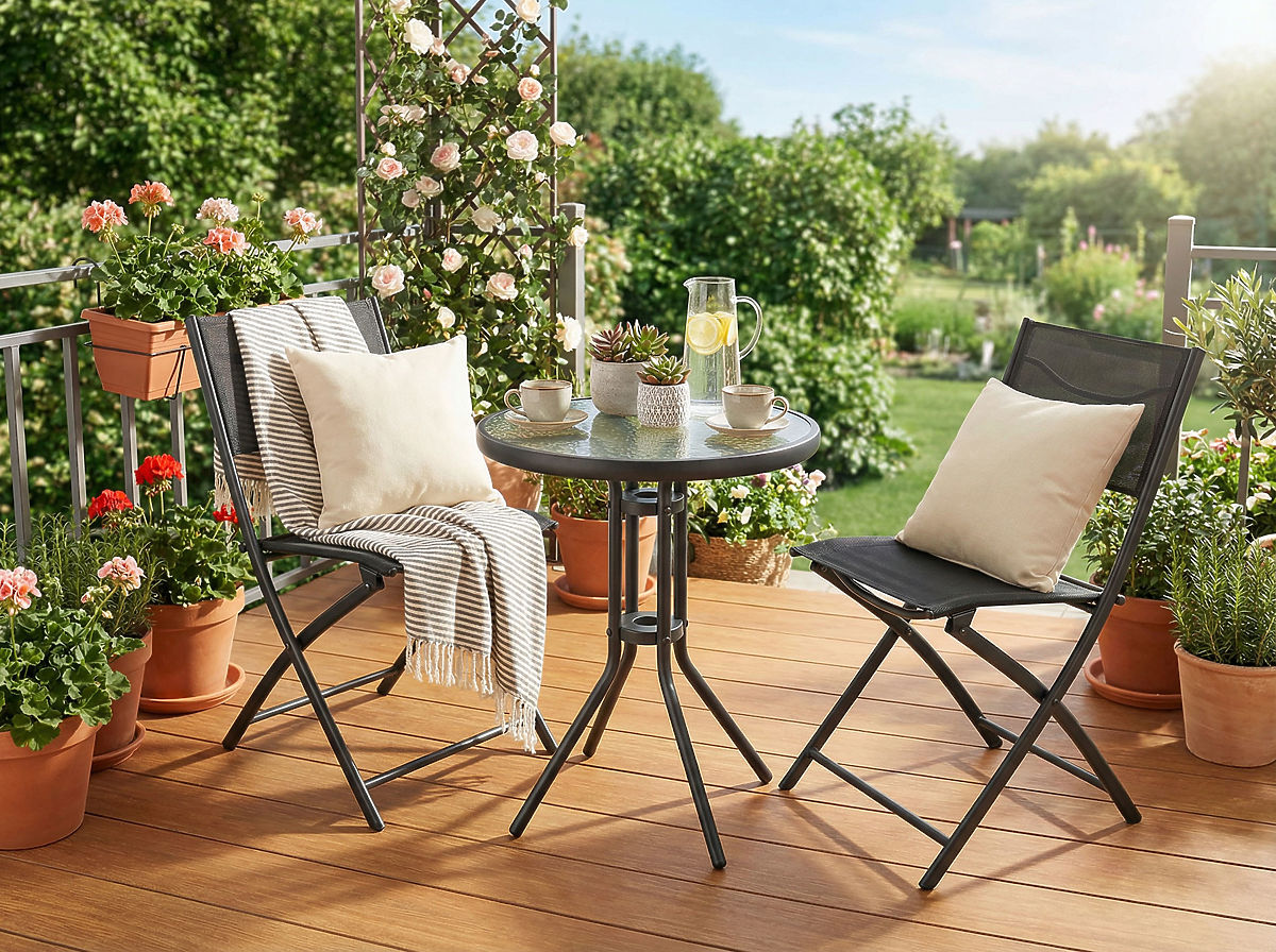 Modell: FLORA | Im Set: 2 Stühle und ein Tisch | Verwendung: Terrasse, Balkon, Garten