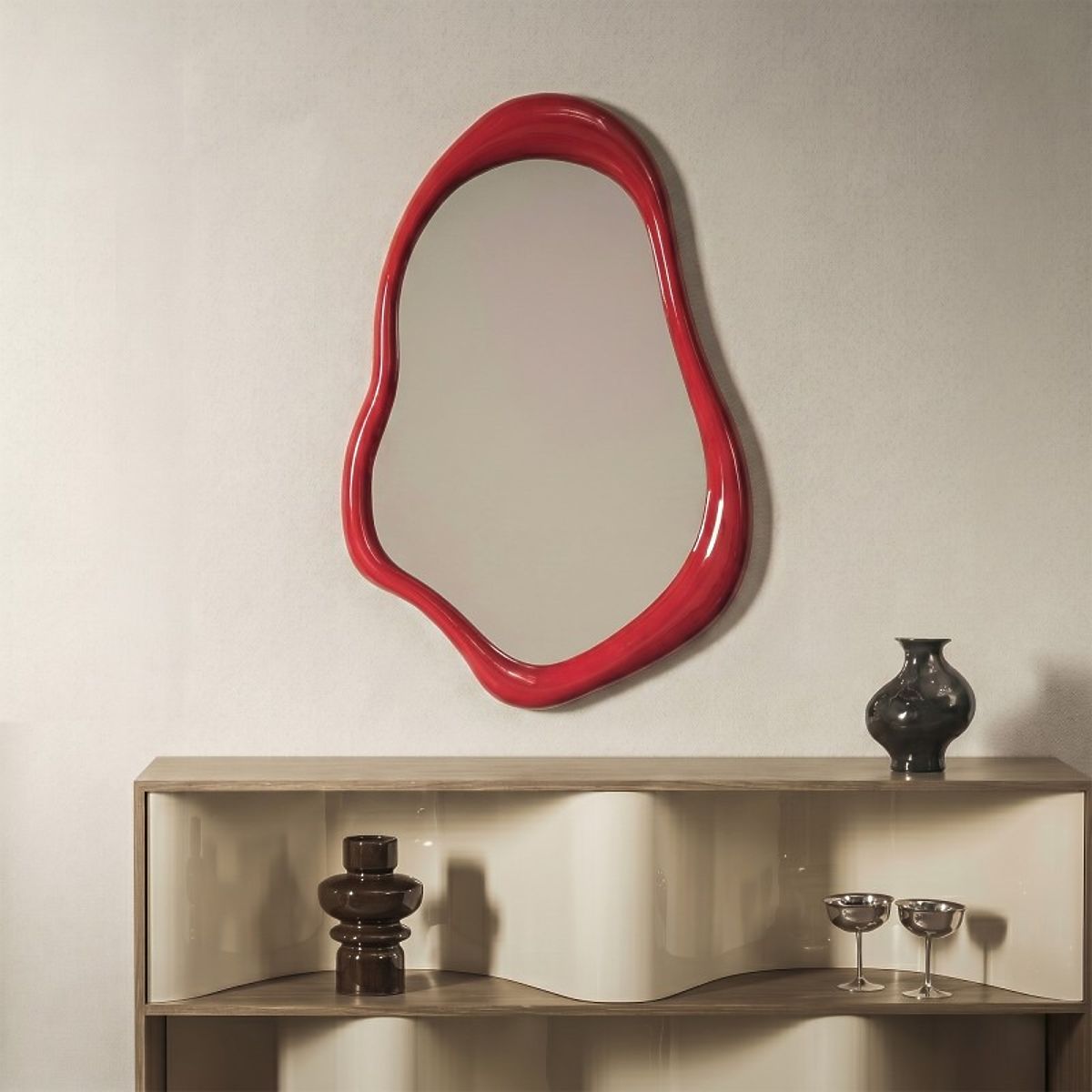 Der Maluma Spiegel ist ein stilvolles dekoratives Element, das auf den ersten Blick Aufmerksamkeit erregt. Der unregelmäßige Rahmen aus rotem MDF, der in Hochglanz ausgeführt ist, verleiht dem Raum Charakter, Energie und moderne Eleganz. Ideal für Innenräume, die auffallen möchten.